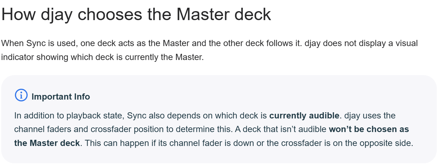 @Bogdanoctav, please note that a non-audible deck cannot be the Tempo Master. In the case where you have only one song playing and audible on the Main Output, only that song can be the Tempo Master - regardless of which deck you press Sync on. In other words. With only one deck playing and audible you can essentially press sync on any deck and audible deck will remain the Tempo Master.