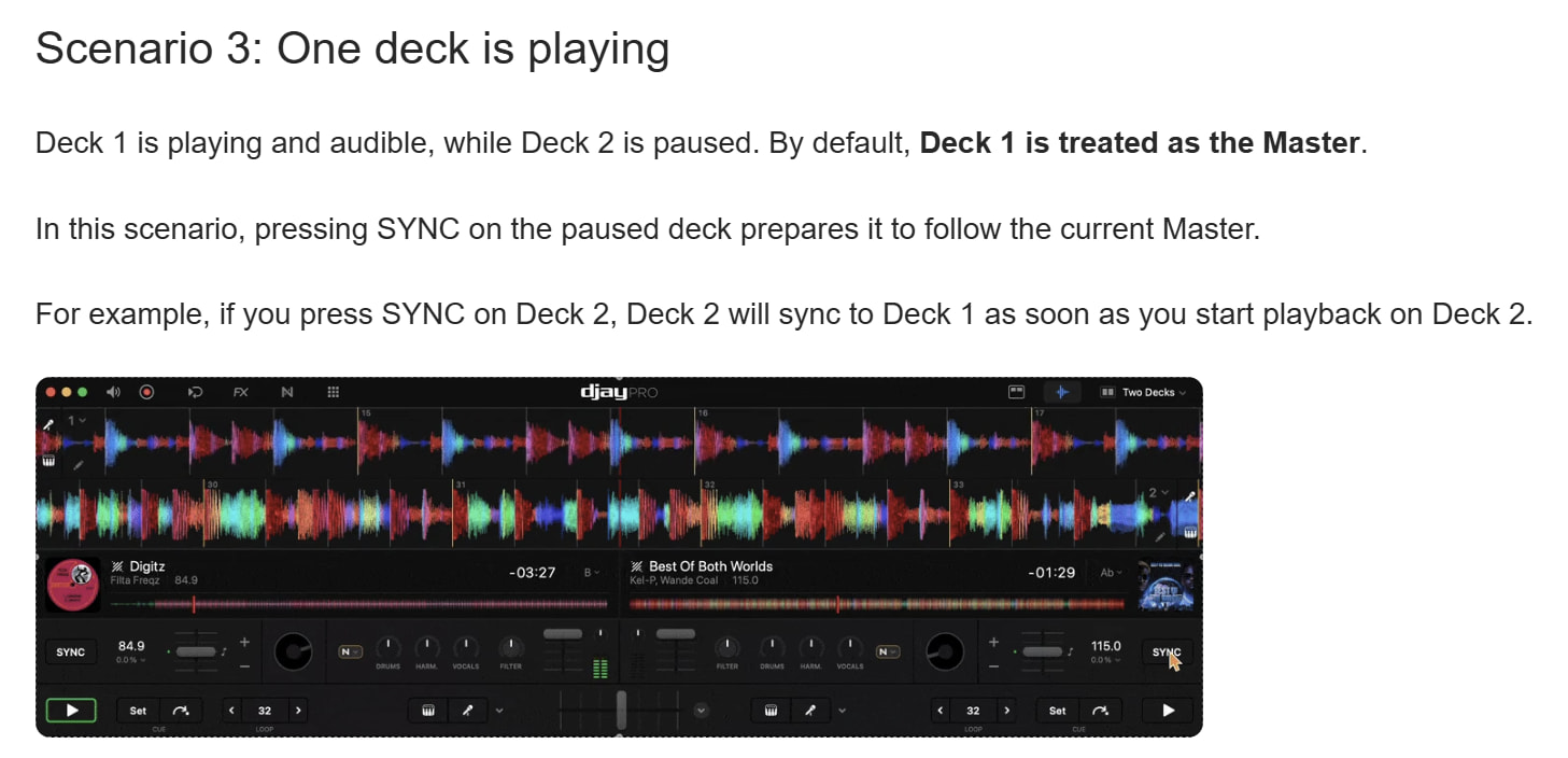 First of all, please refer to our recently updated help topic explaining how sync works in djay. In particular please pay close attention the section “How djay chooses the Master deck”: