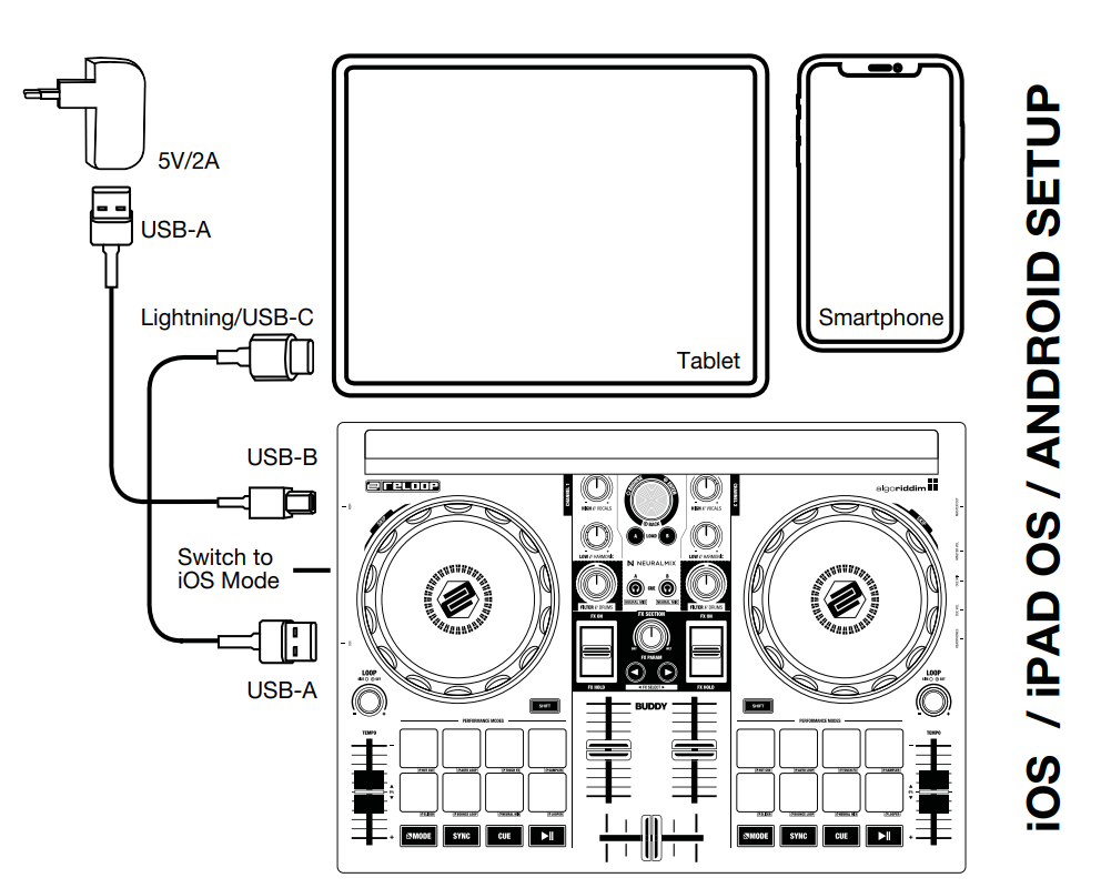 Hi @smashedup, per the Reloop Buddy User Manual, I recommend that you use a USB-A to C cable and connect it directly between the USB-A socket of the Buddy and the USB-C socket of your tablet. Make sure the switch on the left side of the Buddy is set to iOS Mode. Then use a USB-B to A cable to connect the Buddy to a 5V/2A power supply.