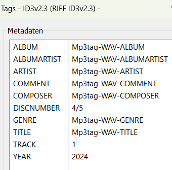 Here is my test file. It is a 1-second sine wave created in Audacity 3.7.7. Tags were added in Mp3tag 3.32, and both RIFF and ID3 tags are present. Tags are encoded in UTF-16.