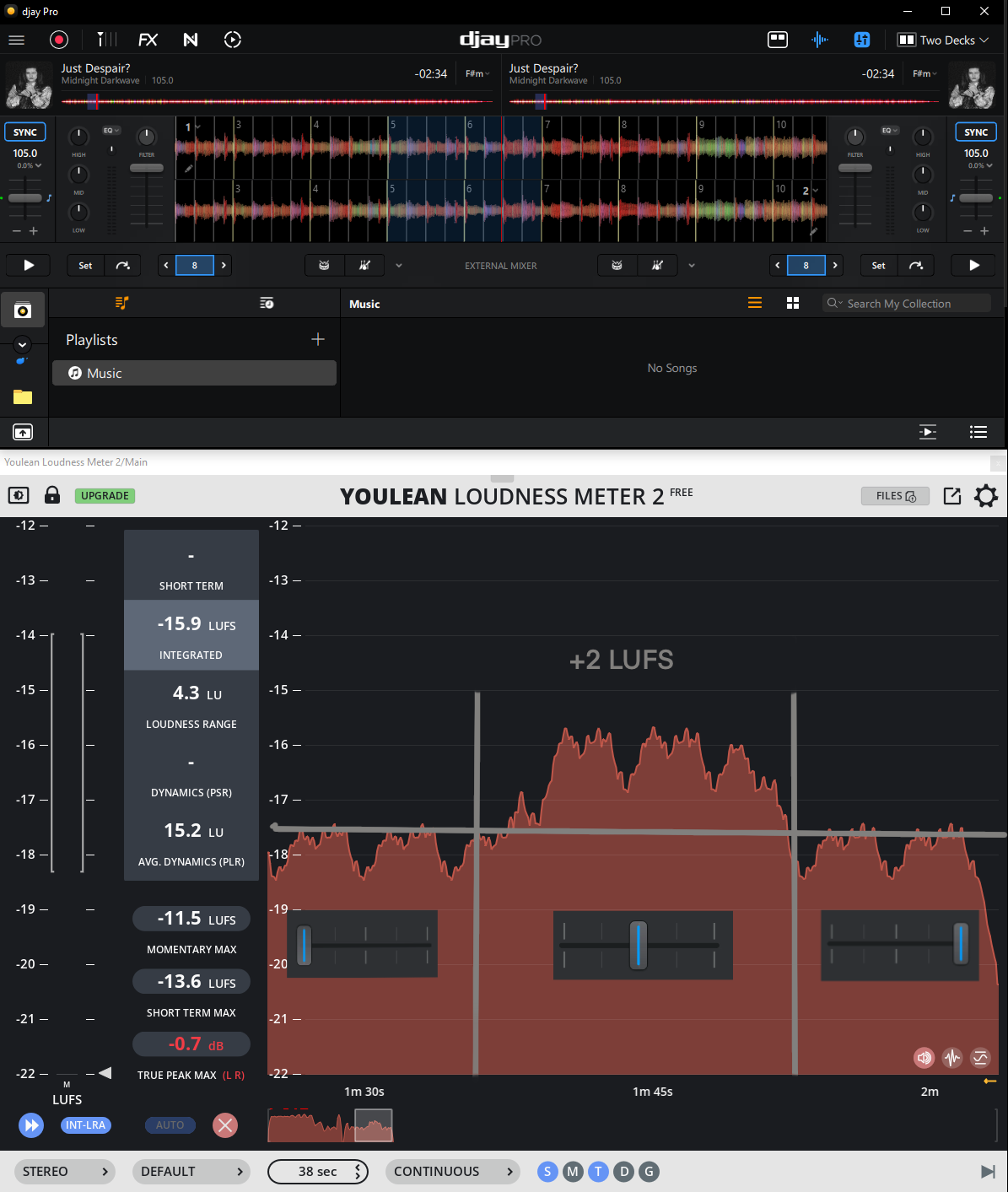 Here is an example: Deck 1 and Deck 2 play the exact same portion of the same track. Both are set to maximum volume, and no EQ is applied. However, when the crossfader is set to the middle position, there is an increase in the overall volume. This is expected behavior because when the signals are identical, they reinforce each other, which increases the amplitude and, in turn, increases the perceived loudness.