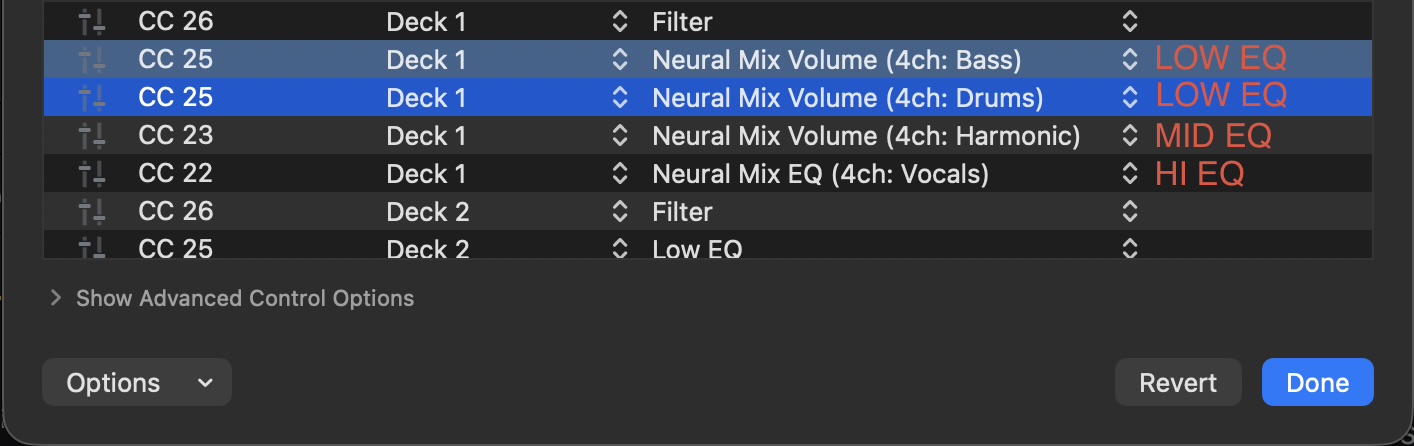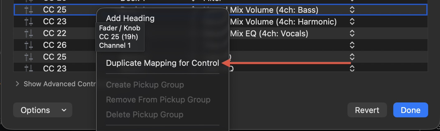 Alternatively, you can use the R-Click menu option in the MIDI Learn tool to Duplicate Mapping for Control option to map both the Drums & Bass to the Low EQ knob.