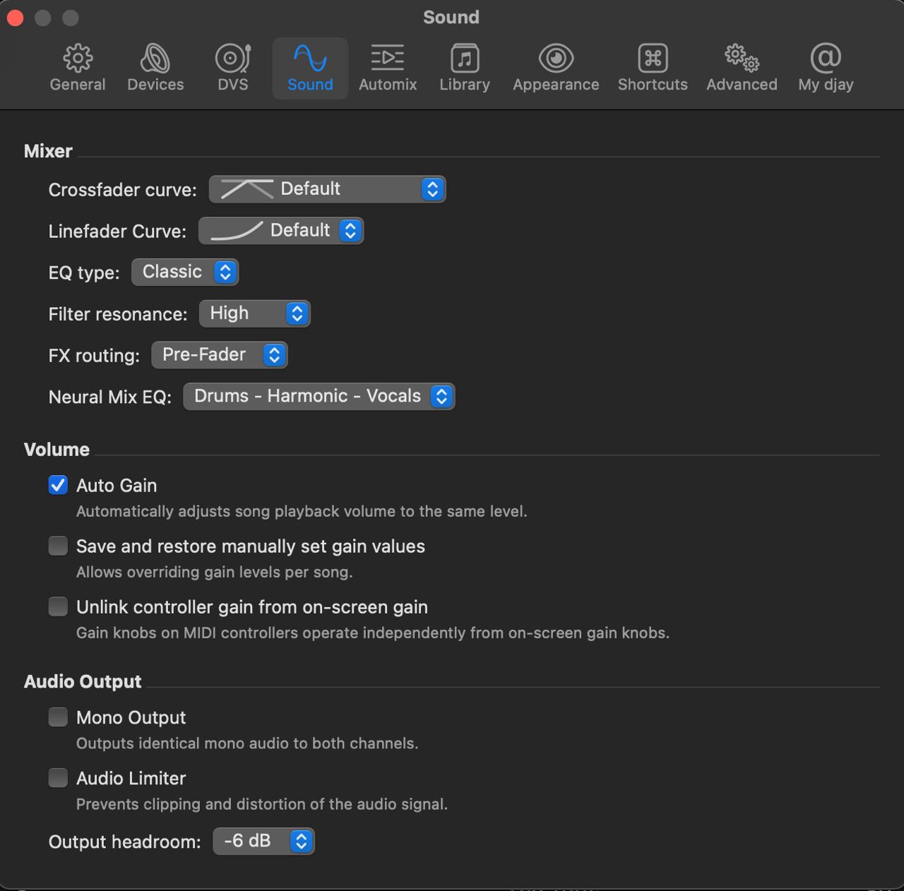 I haven’t changed any of my DJay Pro settings across versions. Same with Serato — I keep headroom at -6 there too. The only difference is that I never use Auto Gain in Serato because it sounds terrible, but I rely on it in DJay Pro because Tidal tracks and some of my local music vary so much in volume.