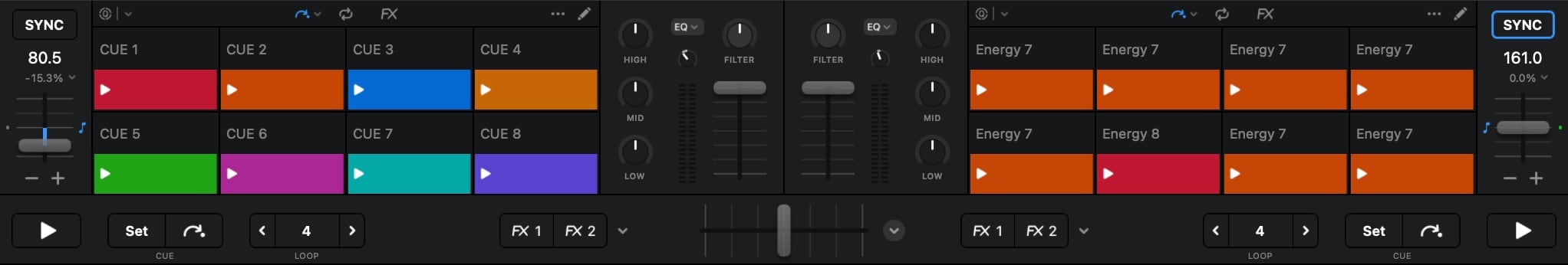 - Default djay colors – Maps cues 1–8 to djay’s default pad colors (red, orange, blue, yellow-orange, green, magenta, cyan, purple)