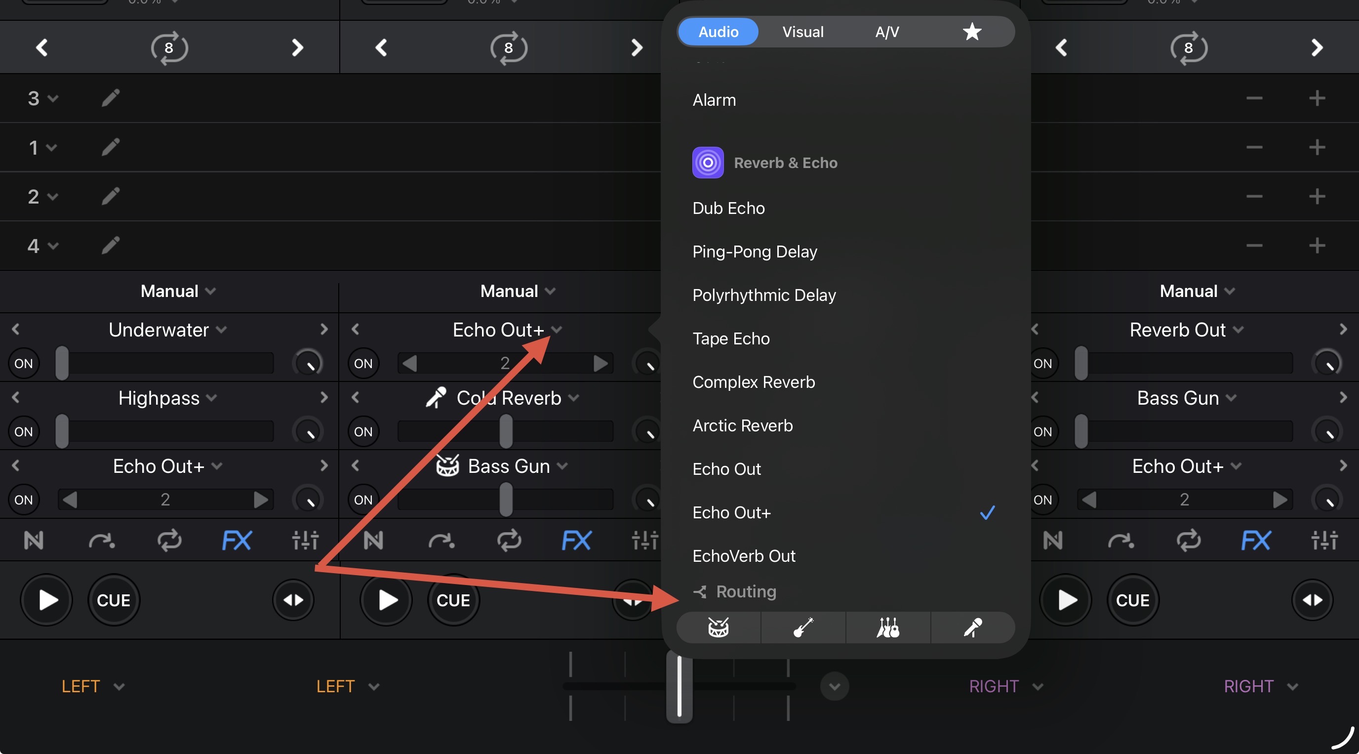 this is not the first time it happens . i have play it without any midi connections so via ipad speakers but have the same results. no FX for instance pingpong delay stops playing atonce when i put the slider quickly down. no matter wat deck i choose 2 or 4 decks.