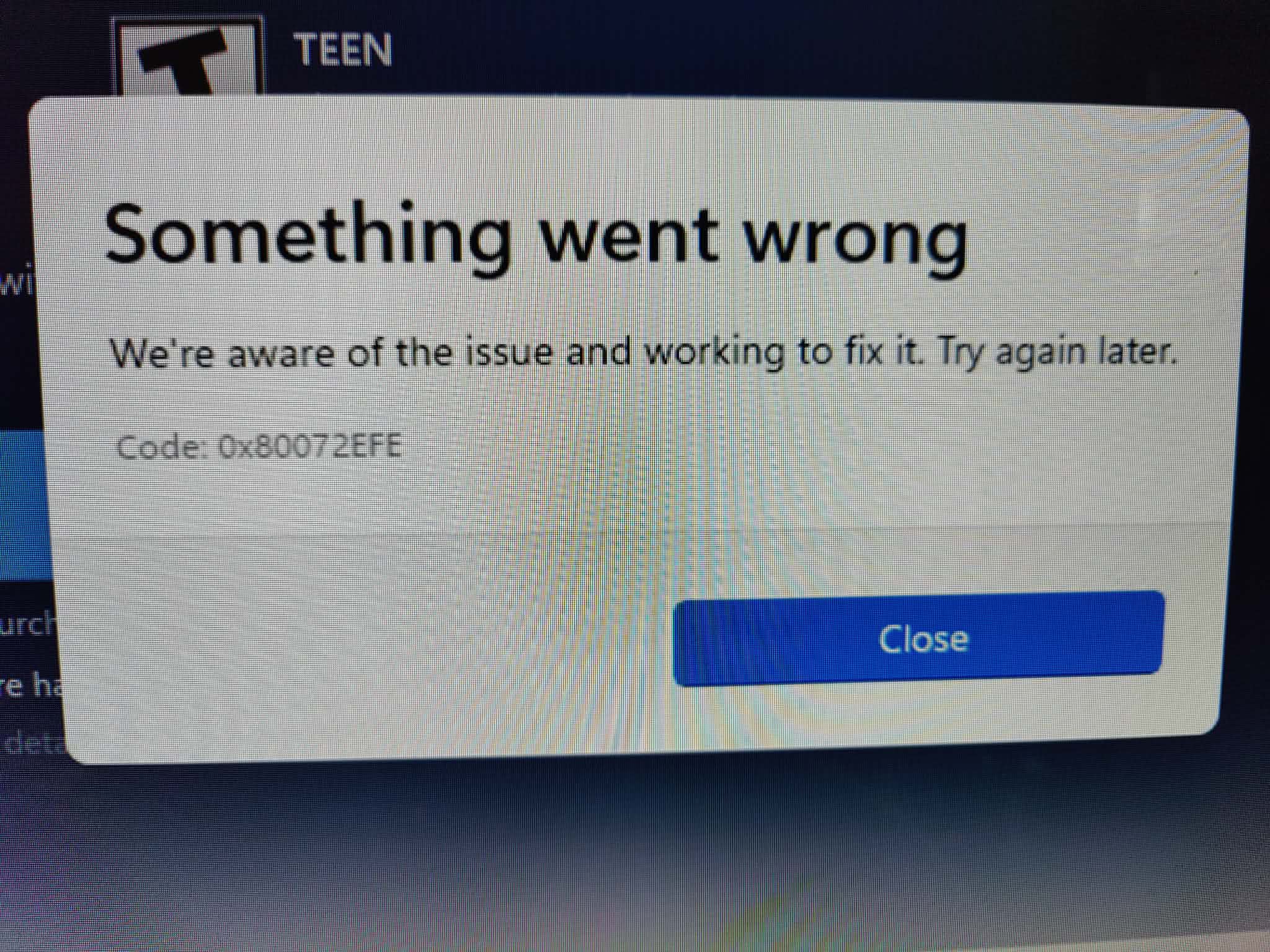 Have you tried googling this error code? I mean windows store 0x80072EFE. Basically, it means one of the Windows Store servers dropped your computer’s connection request but didn’t explain why.