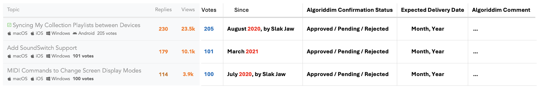 To keep the Community as engaged as it is, and to confirm this voting feature has a real purpose, it would be nice to have a regularly updated feed-back from Algoriddim. At least confirming whether these are really being approved, considered, or rejected.