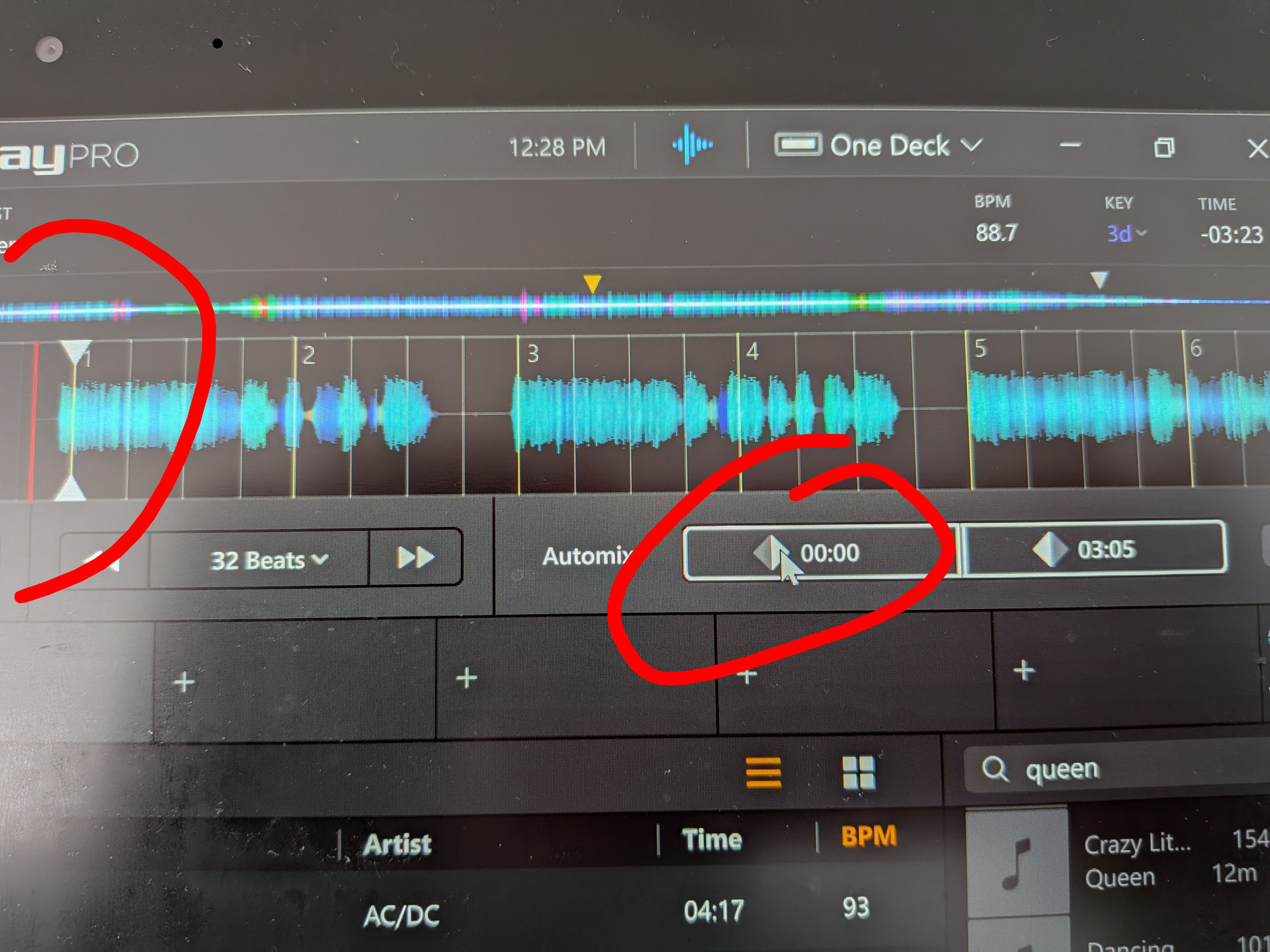 The screen shot above shows an older recording. Top left you can see that the start of the file is about 1 beat before there’s any sound. So I set the start cue on beat one of the grid, using the automix / one deck view (red circle on the right in the screen shot).