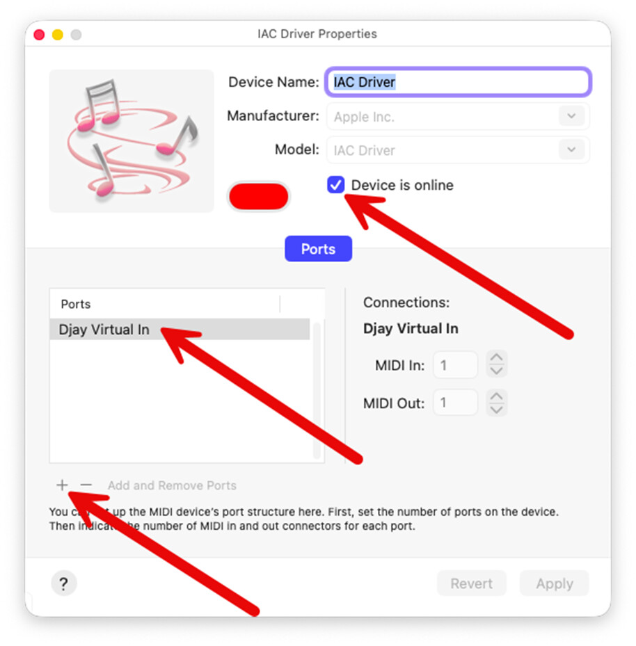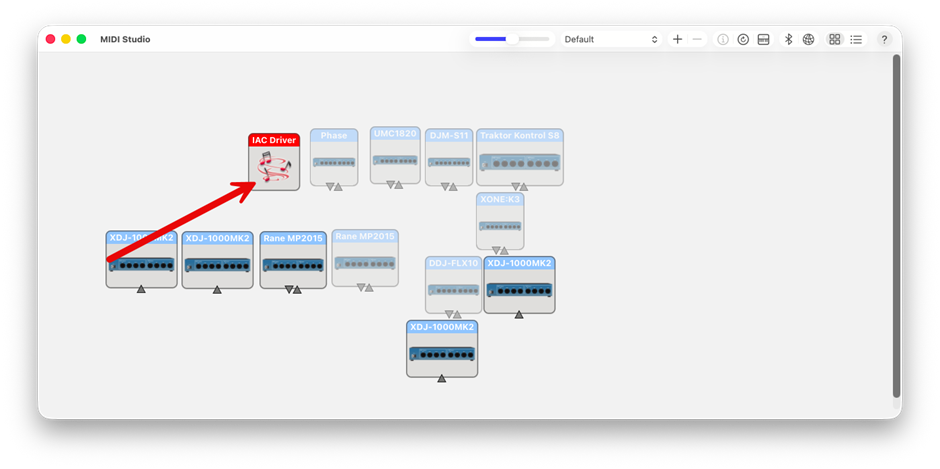 In order to create a chain of MIDI commands between devices, there is a built-in function in MacOS called the “IAC Driver” which needs to be enabled and have a (MIDI) Device name created.