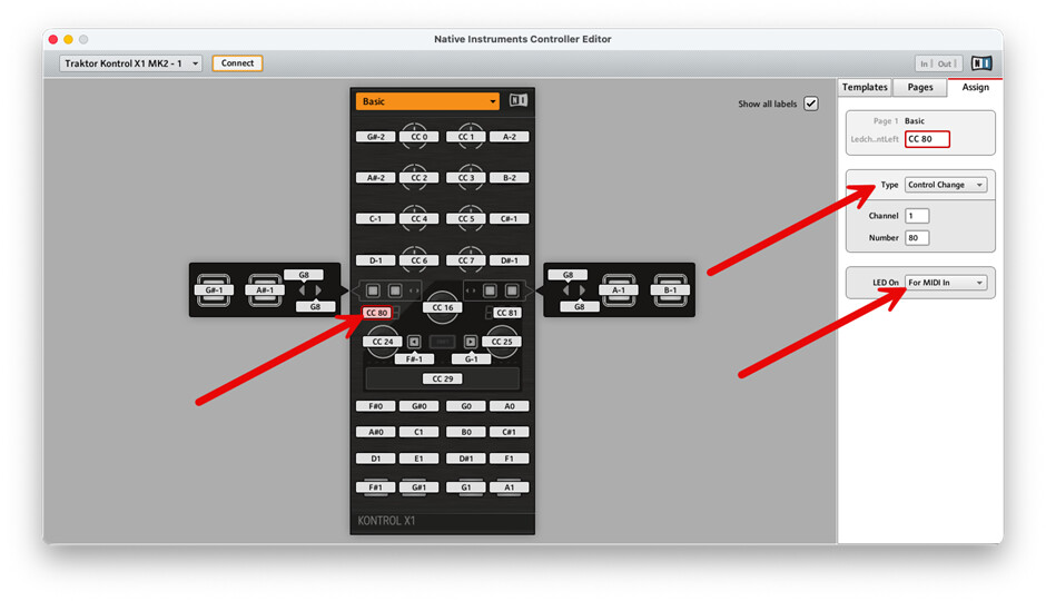 1.) Configure the LED Displays with an unused CC number, I used 80 and 81, with the LED display reacting to MIDI In (not MIDI Out!)