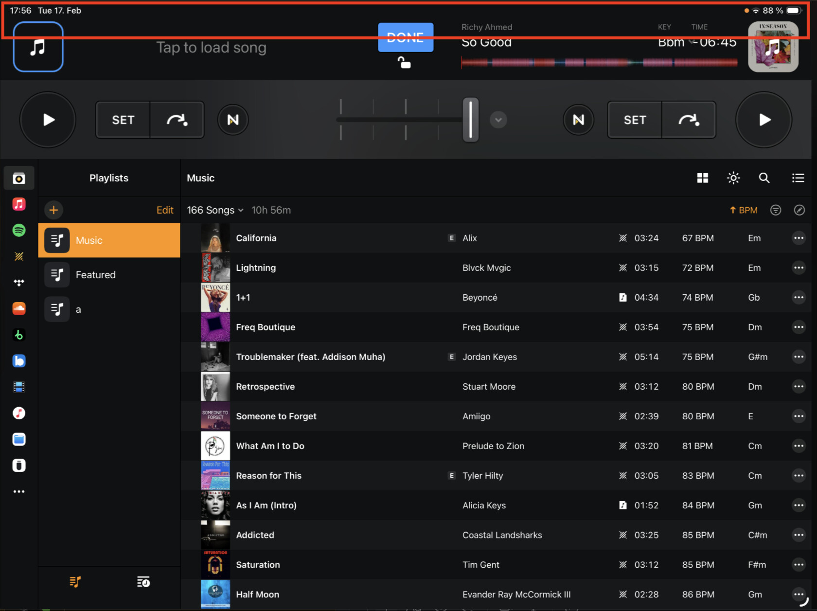 When tapping the album art to load a track, in the “Pro” layout view, with the “Mixer” tab activated (though only tested with this layout view), the library list scrolls to the top at times. The bug happens, in my findings, regardless if sorting (by BPM, for example) is enabled, or the music source (only tested with My Collection and Apple Music).