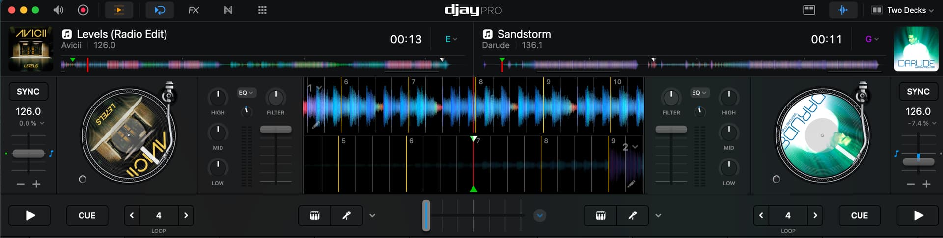 On Deck 2, the next track, “Darude”, which is 136 BPM, but will start at 126 matching “Levels”
