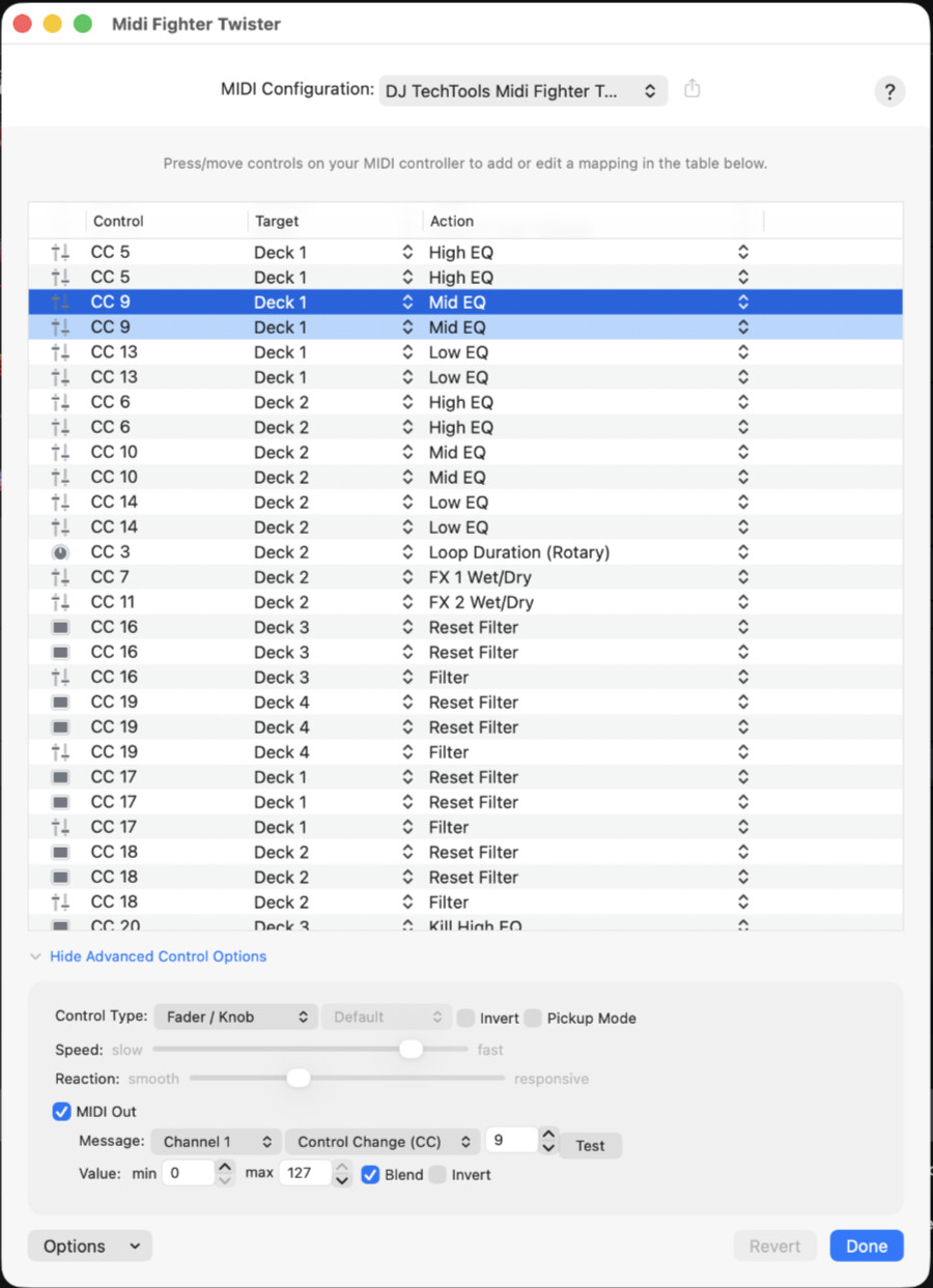 I am mapping Neural Mix EQ (3 or 4 channel) on the Midi Fighter Twister as separate encoders. Works fine, except for the Output. Even though the encoder is set as a detent on the Twister, DJay sends a 127 at the 12 o’ clock position and every move past that stays 127.
