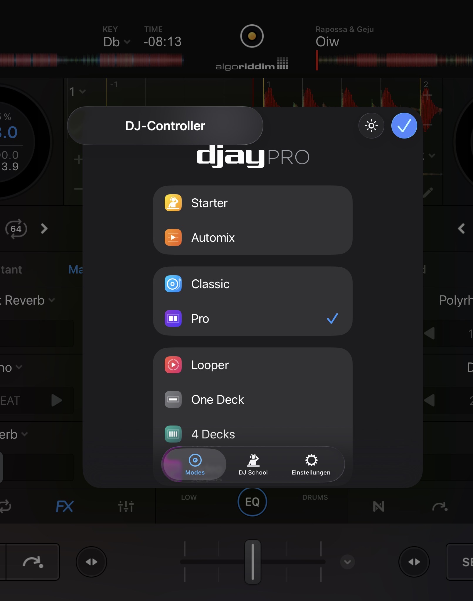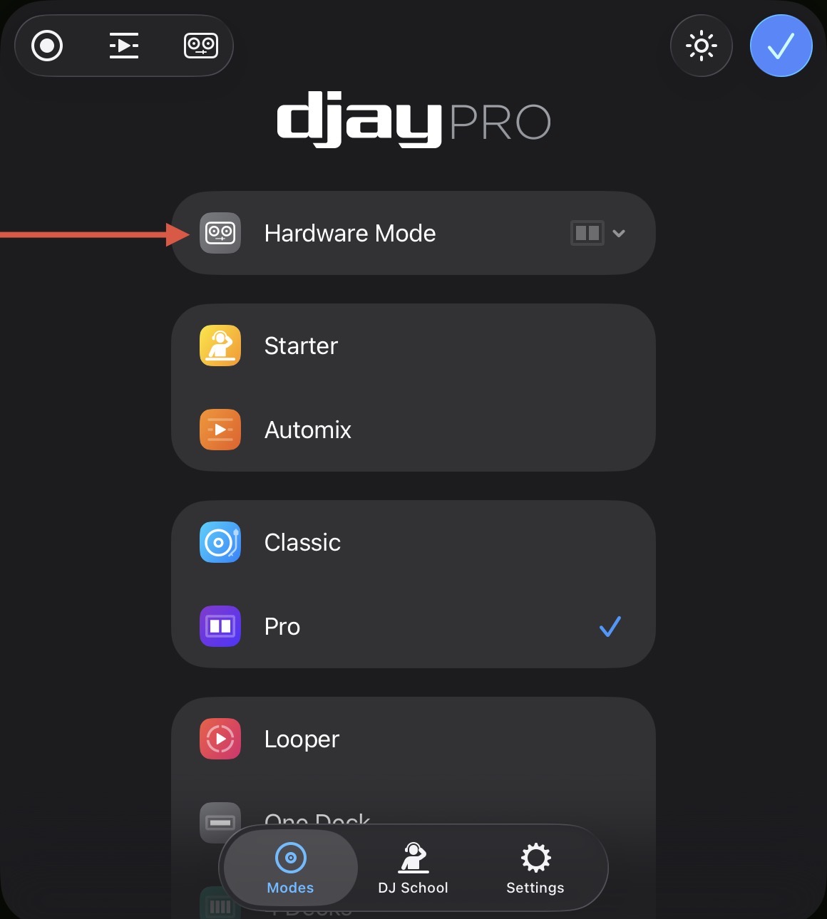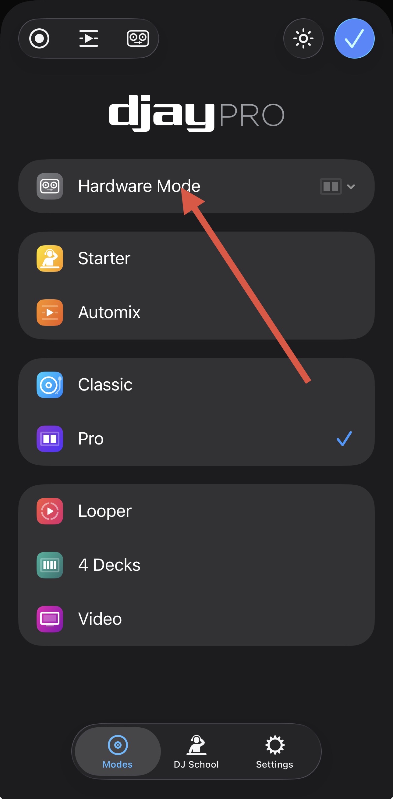 I am trying to switch to hardware mode on my iPad DJay installation. I think i found the new position of the button on top of the “Modes” PopUp Window, besides the icons for recording and automix.