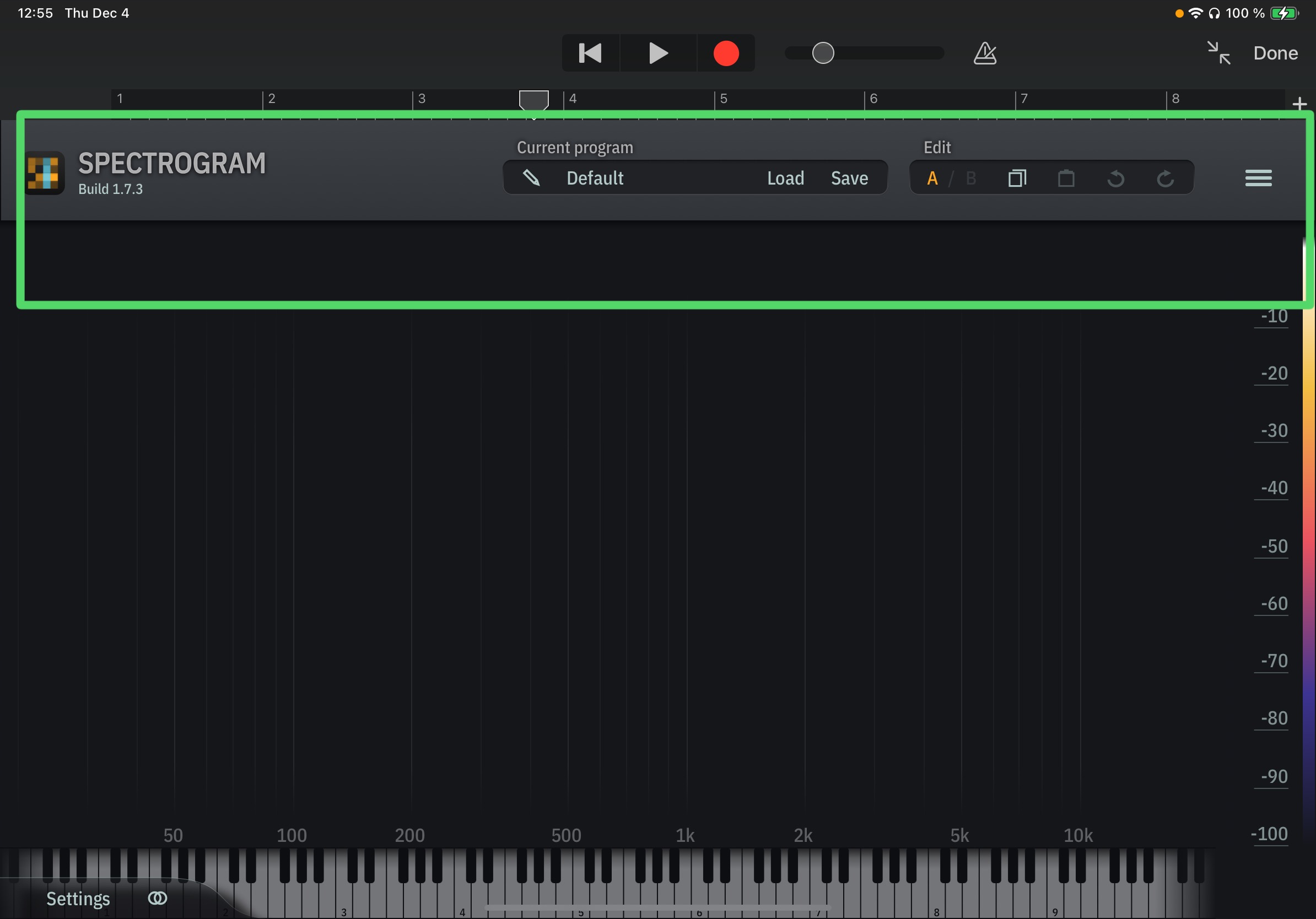 The plugin’s GUI is shown entirely, and all UI elements can be used. Here’s how TB Spectrogram looks when loaded in GarageBand.