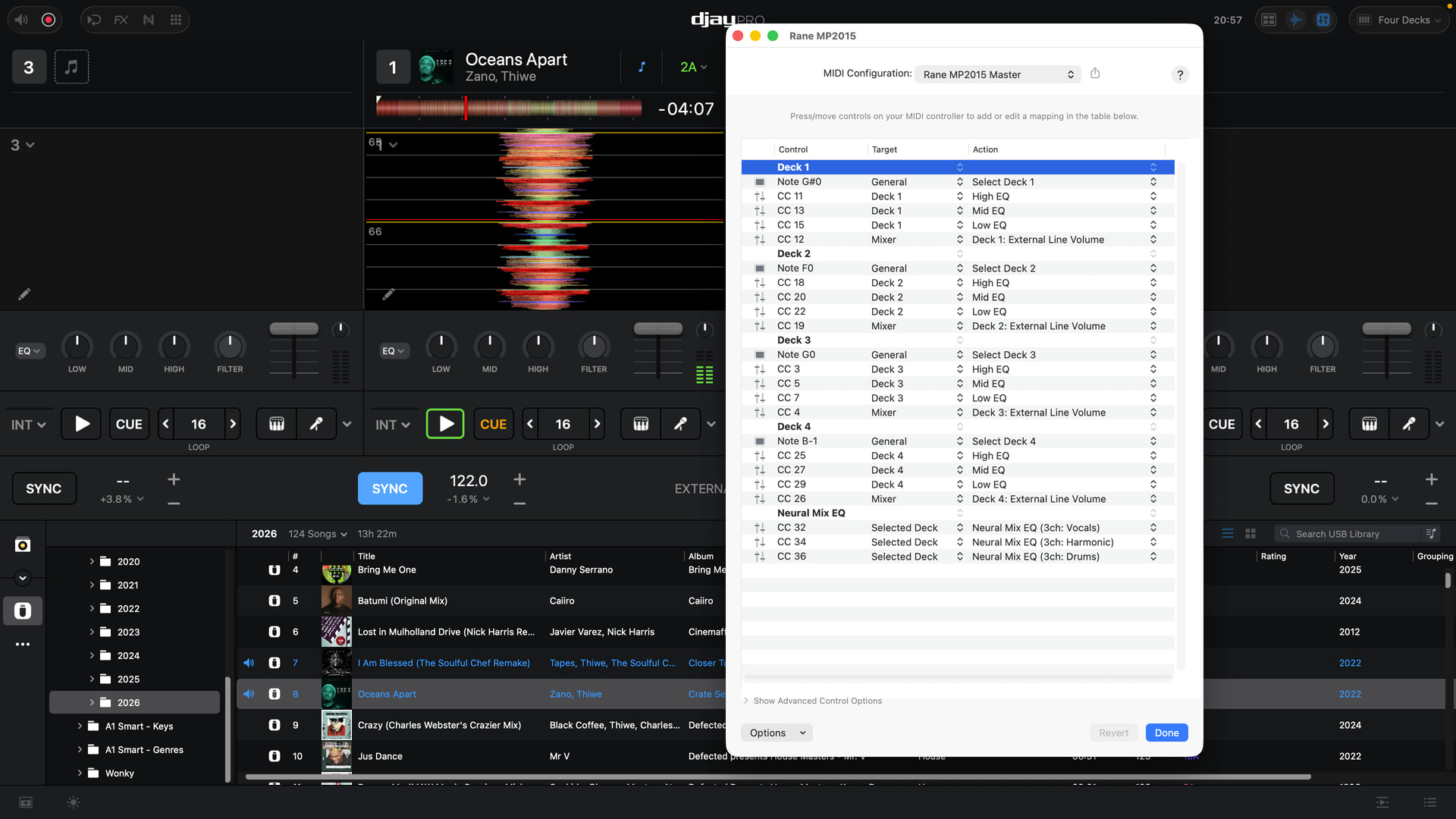 3.) Use the Sub (blue) button above each channel to make that channel the “Selected Deck” in Djay Pro. Map EQ Hi to Acapella/Instruments 2 Ch Filter. Map EQ Mid to Neural EQ 2 Ch Vocals. Map EQ Low to Neural EQ 2 Ch Instruments. Using this combination, you can quickly apply decent NM changes to the selected deck directly on the Rane. I’m still experimenting with this a bit, and one caveat is that the Sub Channel volume needs to be up as you activate this on the mixer, even though it is also MIDI mapped. (I’m going to experiment more with other controls that will trigger “Selected Deck”)