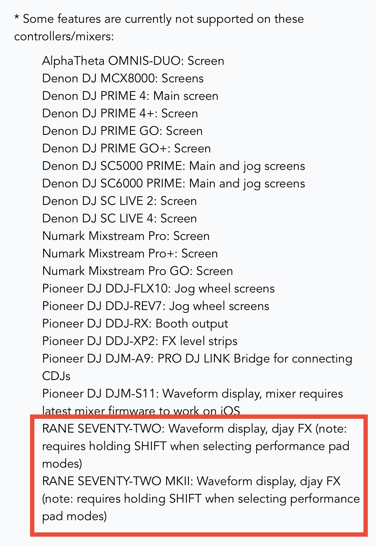 For mixers, currently only the Reloop RMX95 and the Reloop ELITE. The REV7, RANE Four (not supported on iOS), RANE Performer (not supported on iOS) and RANE One also work with NM EQ in external mixer mode - but these are not standalone mixers.