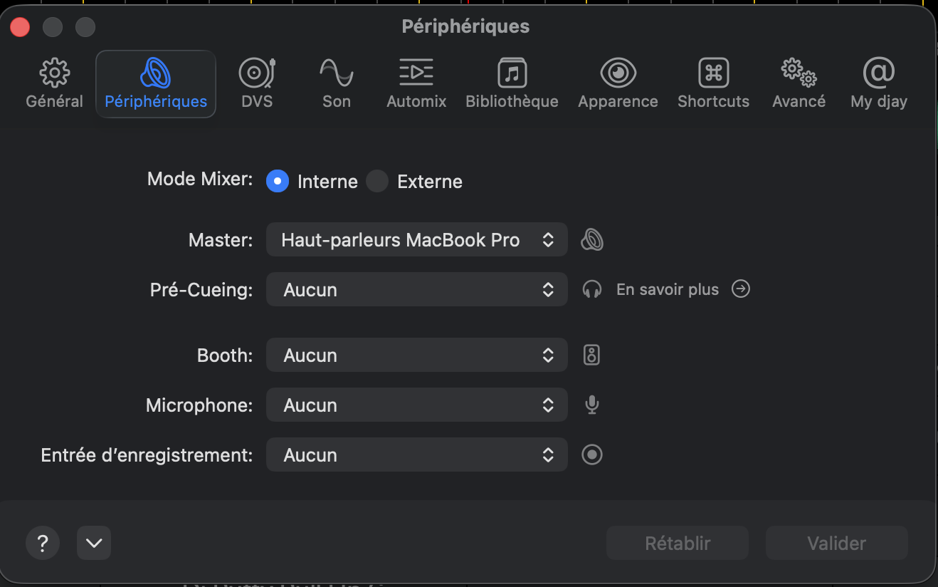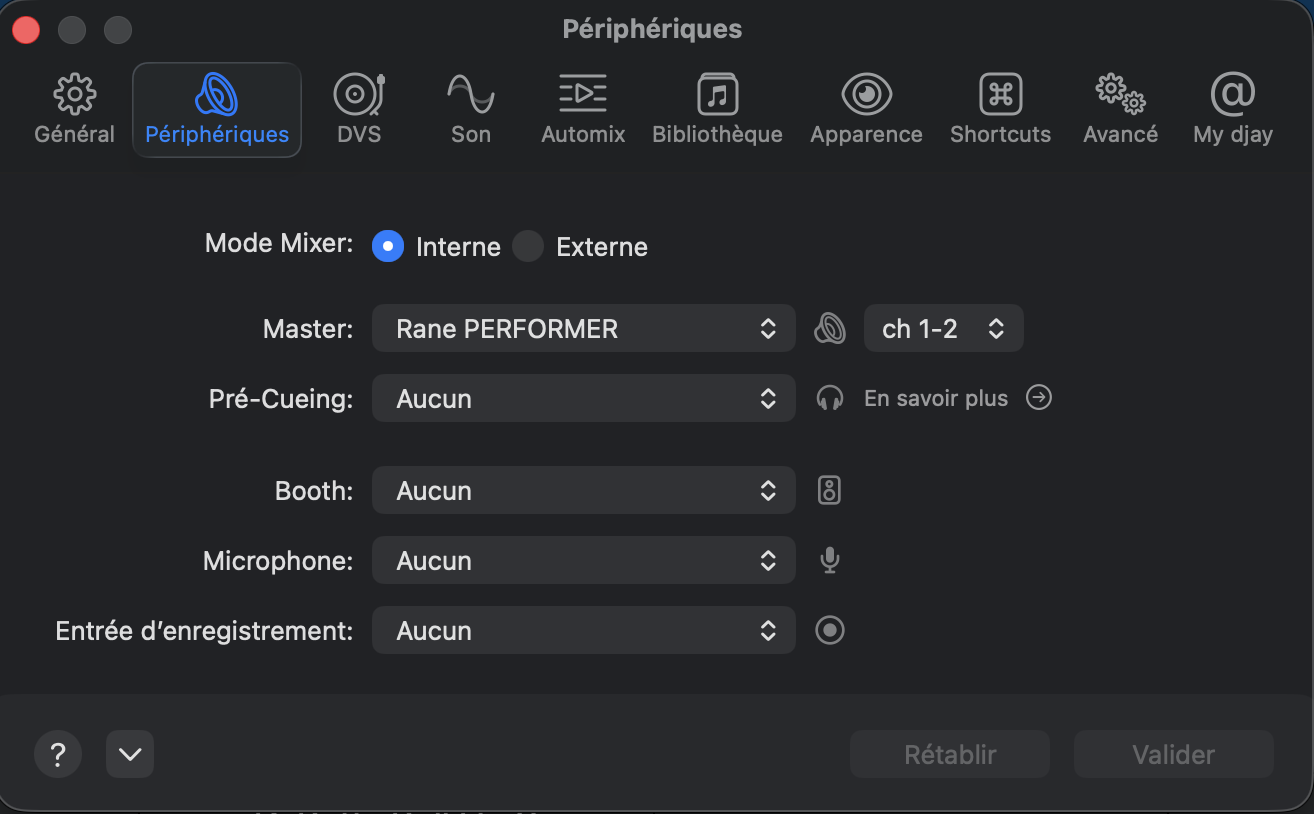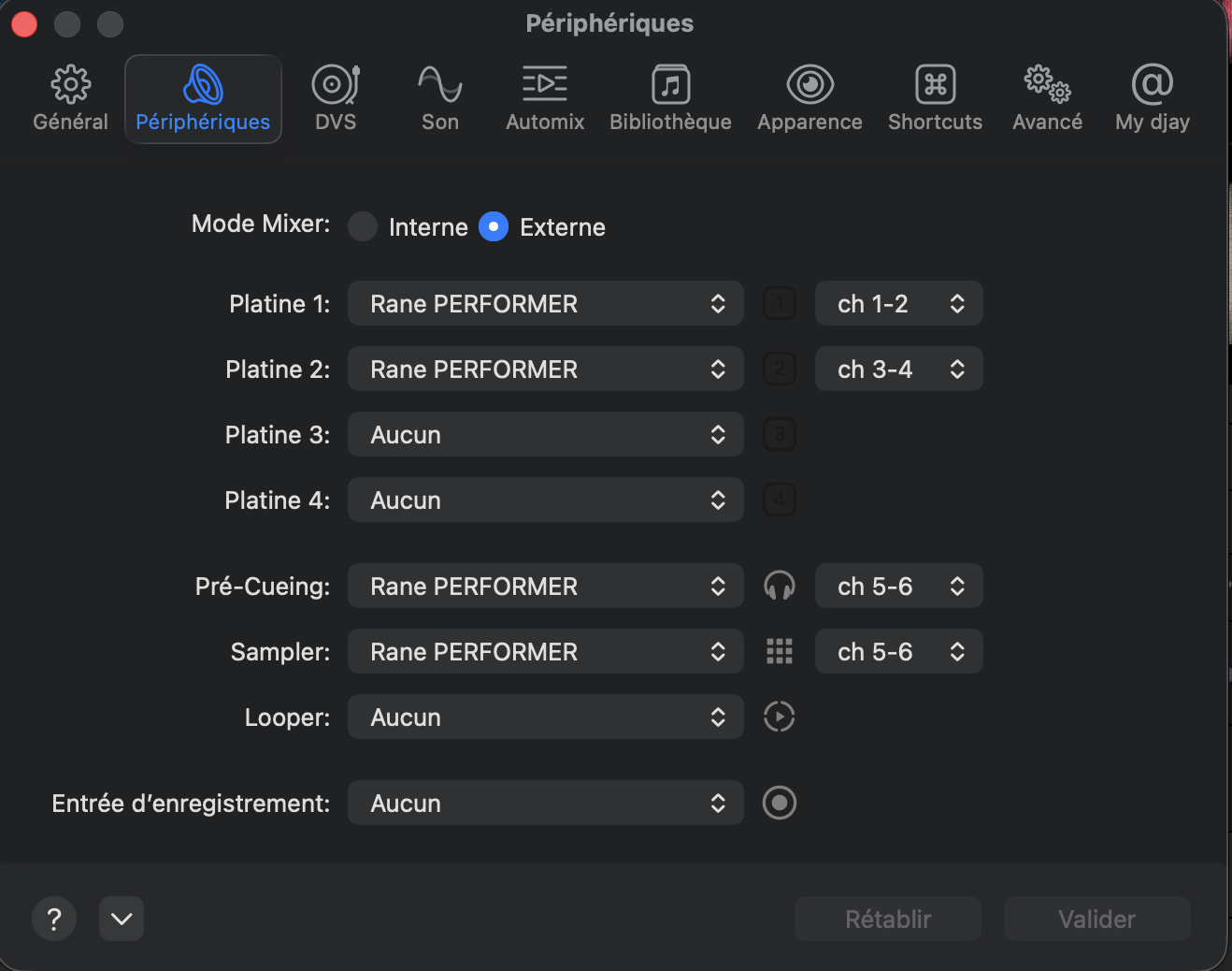 When I am in external mixer mode, I can assign the channels to the different outputs, and thus I manage to get the decks working, but with a setting that doesn’t seem logical to me: Deck 1 = Ch1-2 / Deck 2 = Ch3-4.