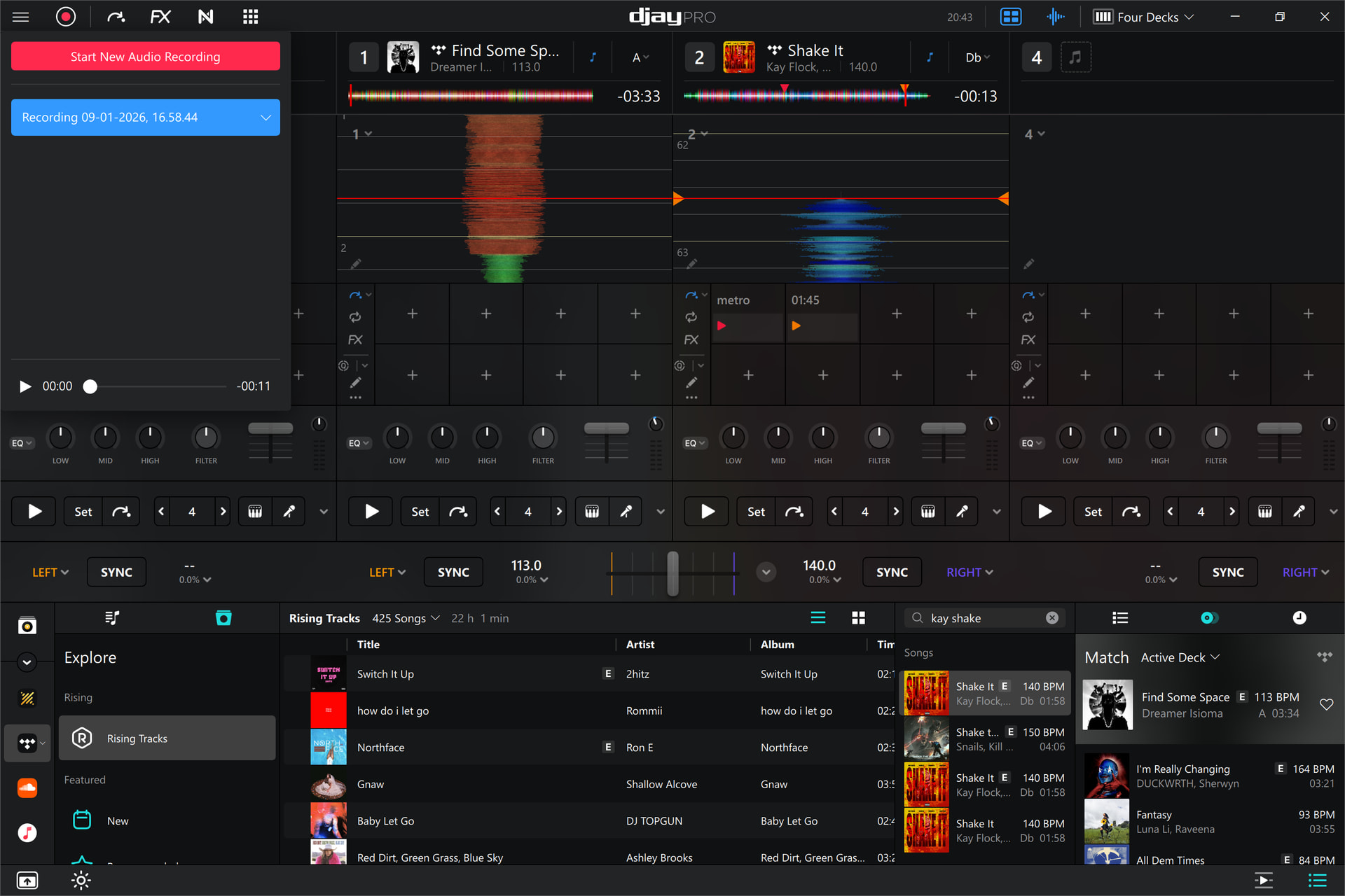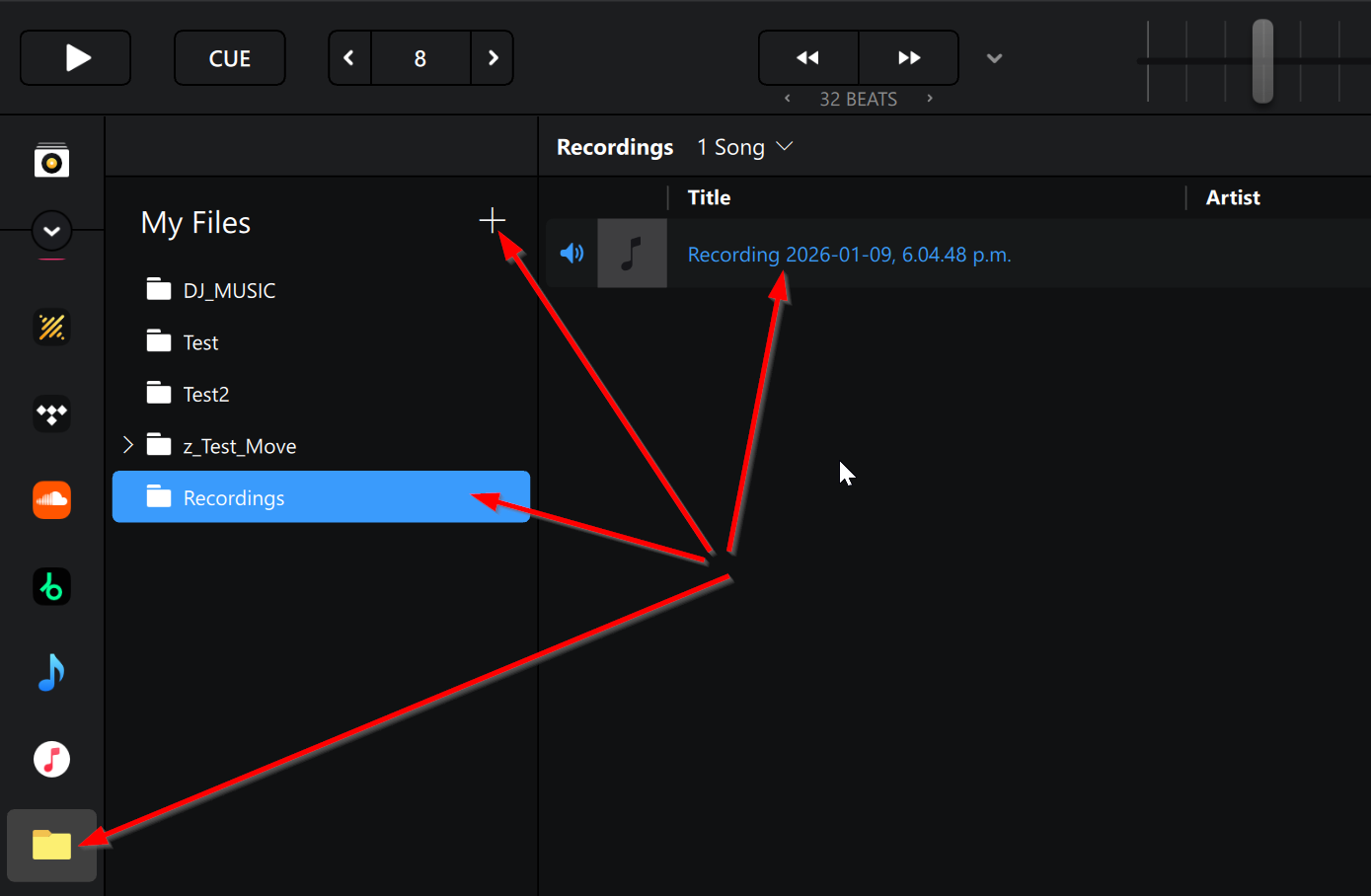 Alternatively, you can select the My Files source in the library and add the folder that contains your djay recordings (%HOMEPATH%>Music>djay>Recordings). Then you can load your recordings from there.