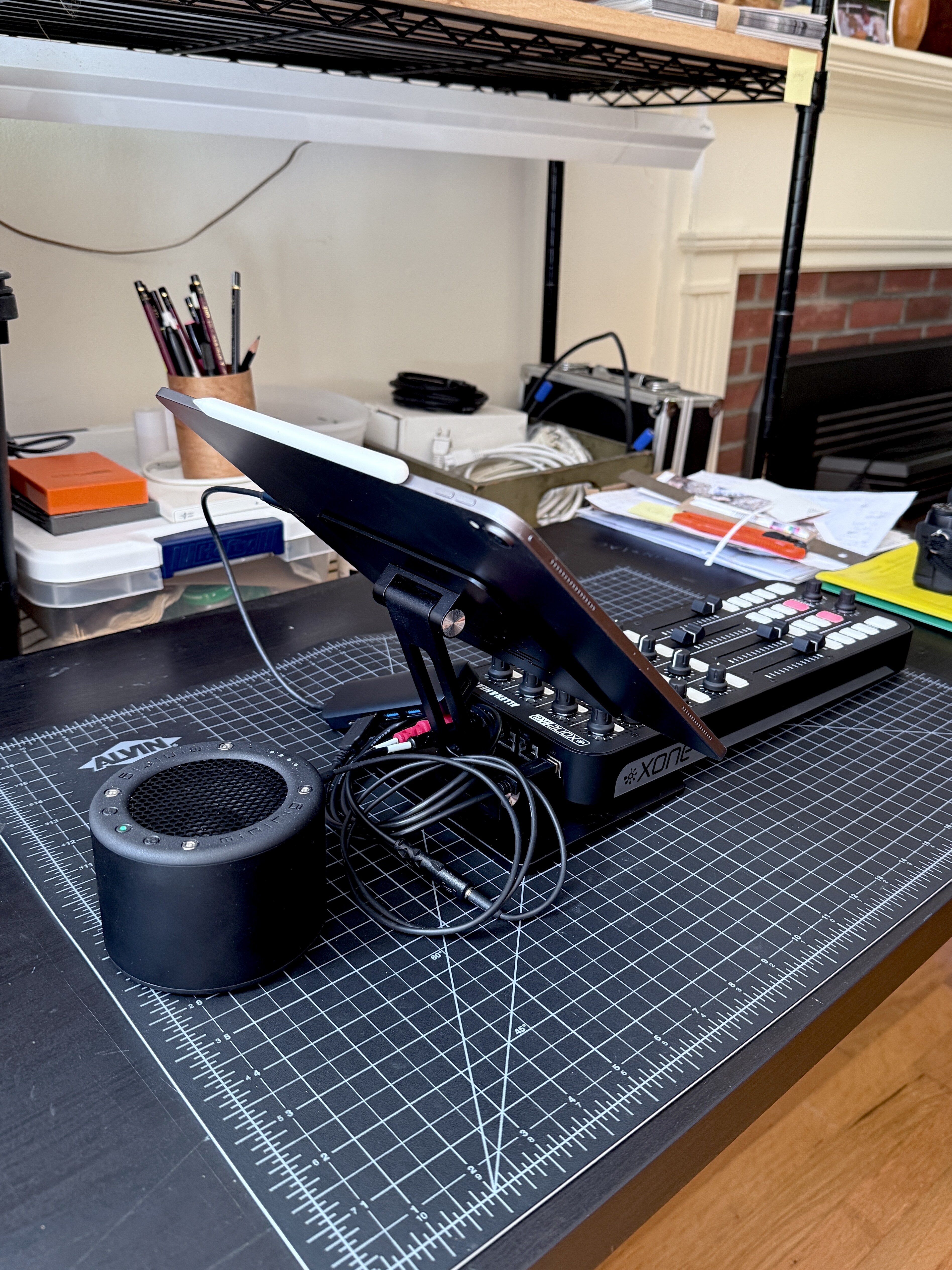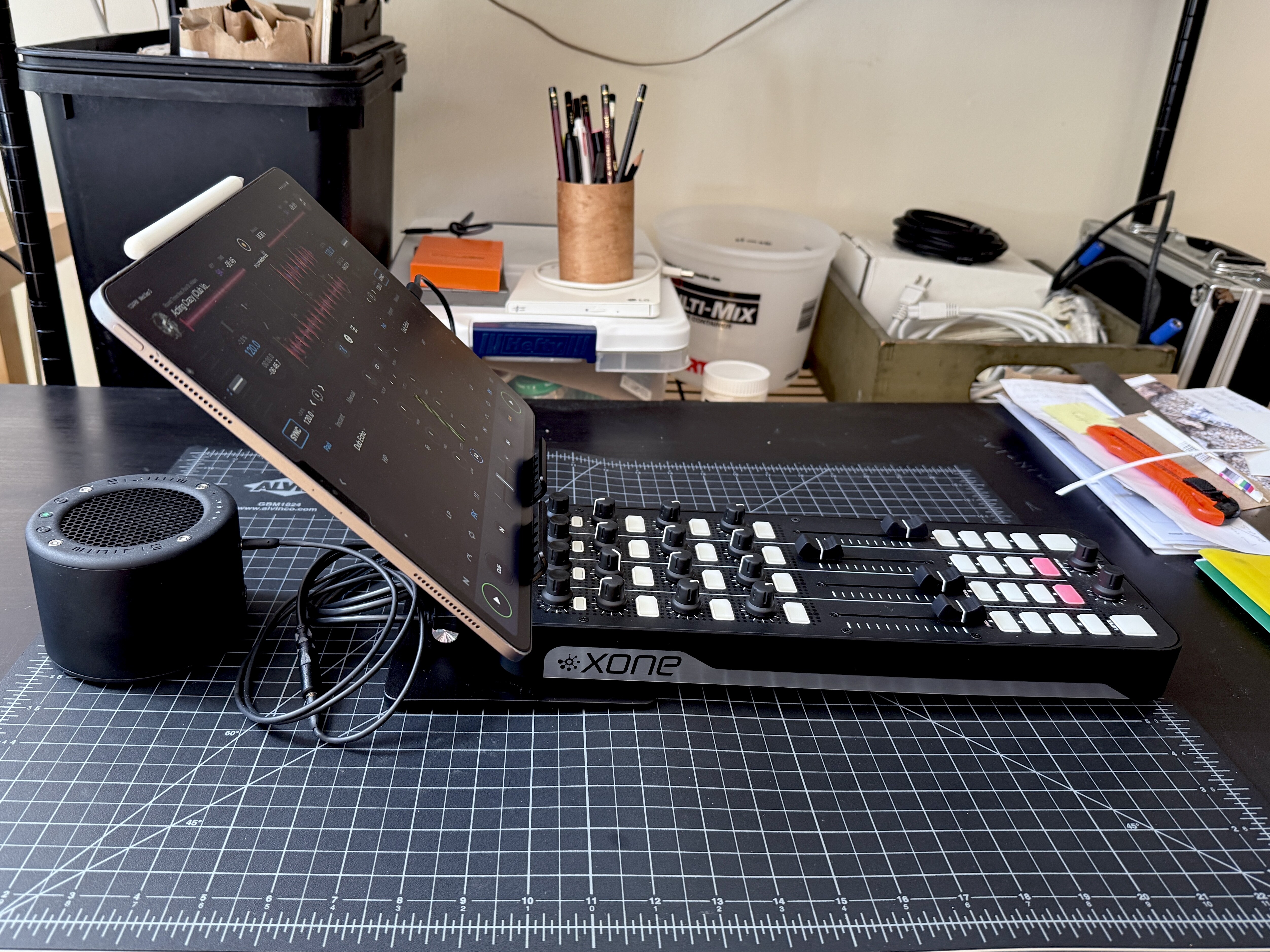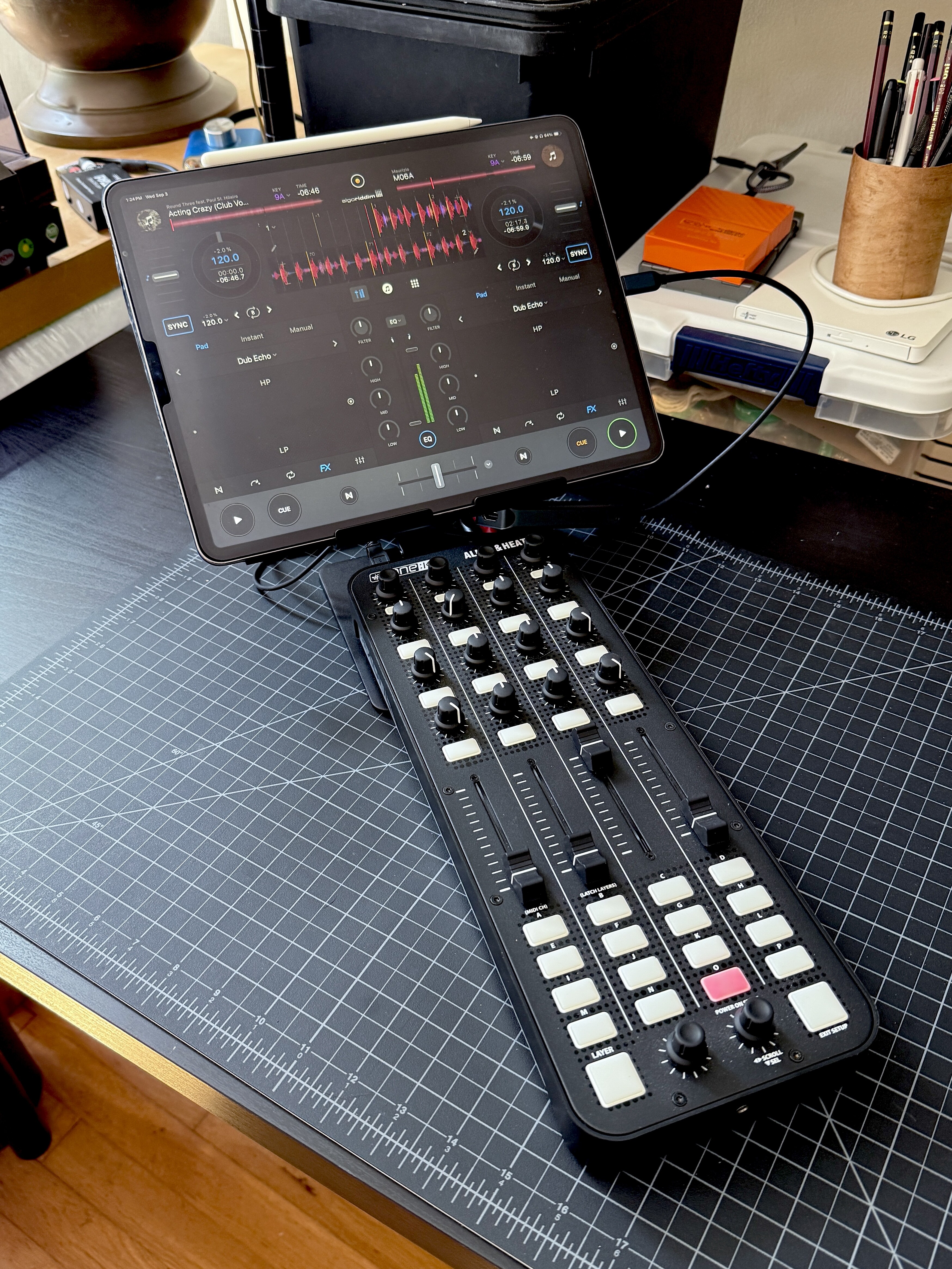 I did the first show with just the iPad and Djay, got the controller the next month and finally polished it off with the stand just a couple weeks ago – really ties the room together. Also just added the Minirig 4 speaker for the home and party.