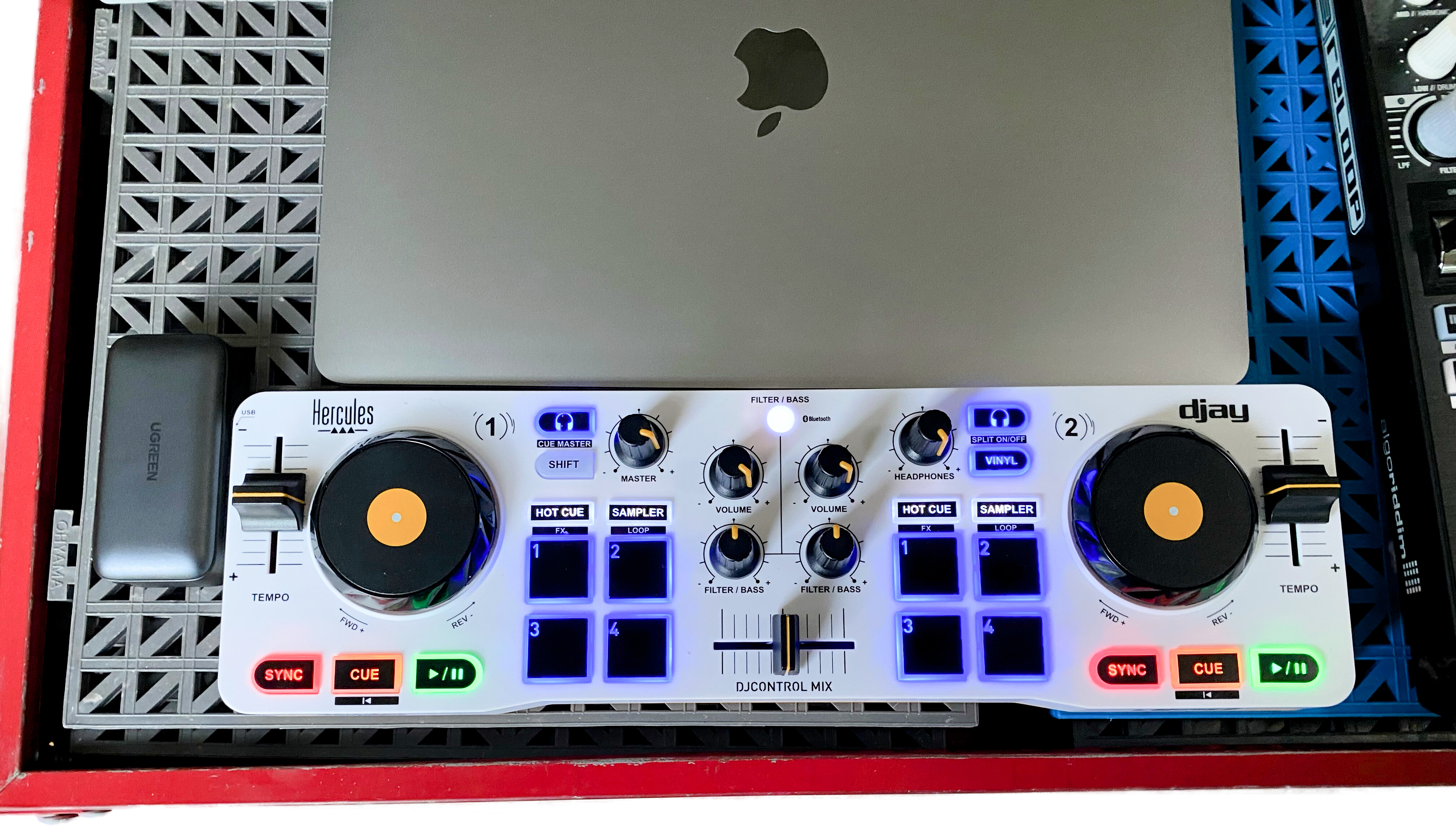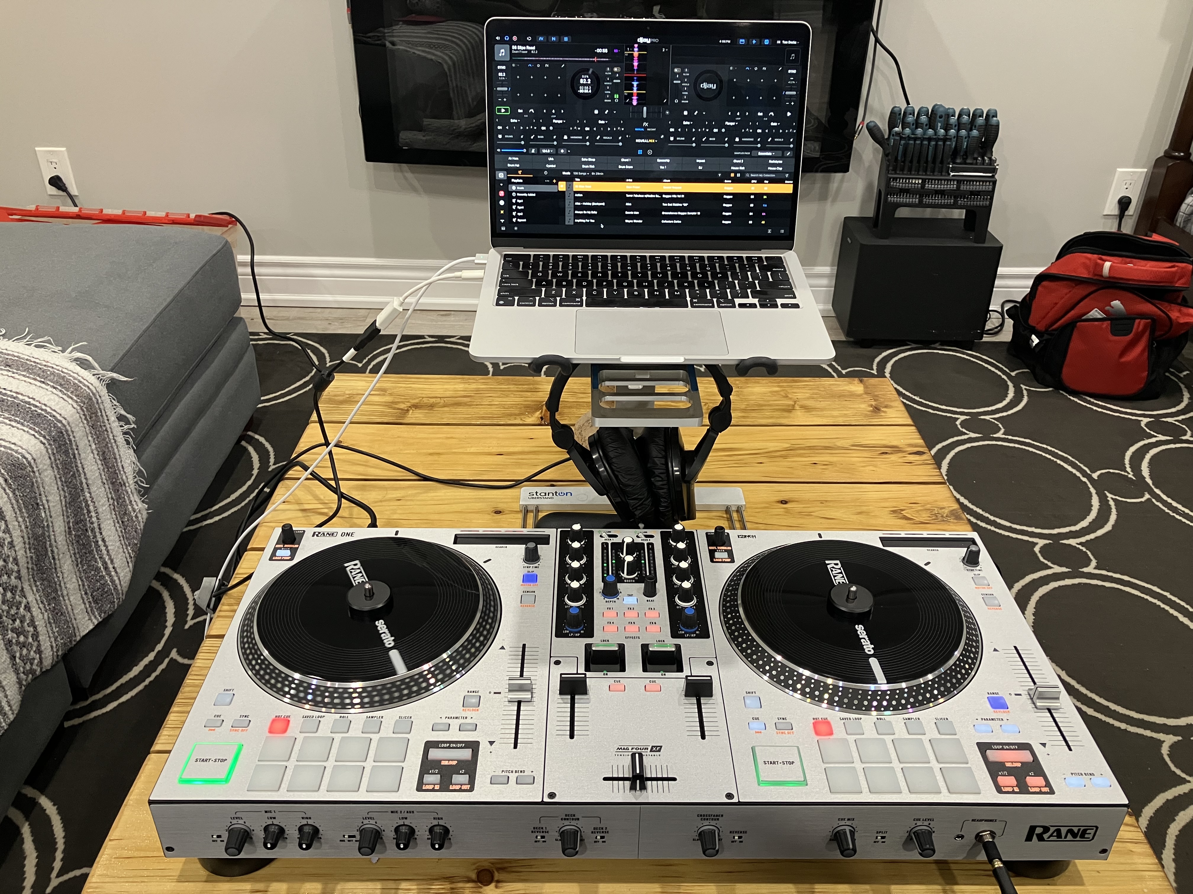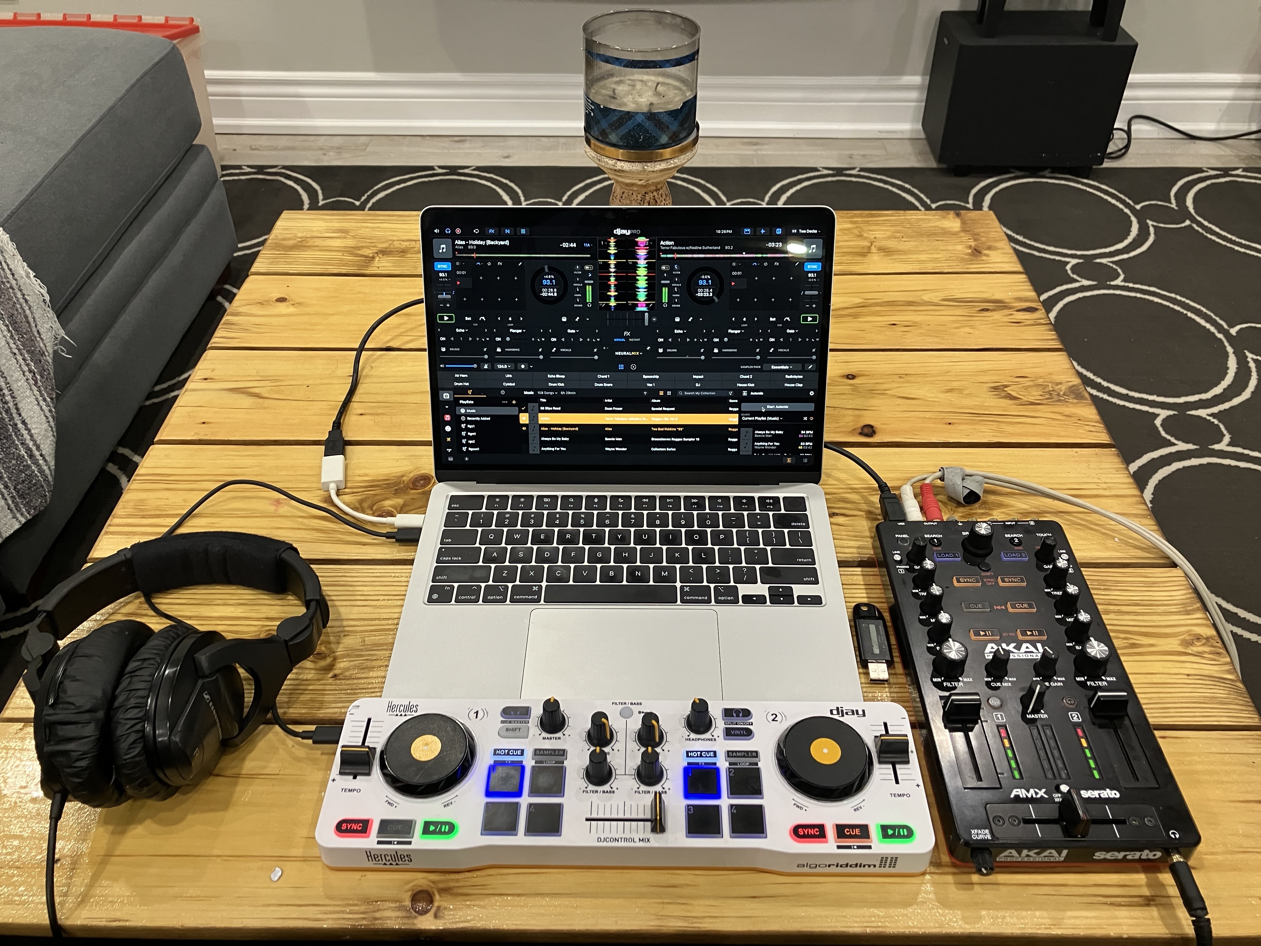 I did the first show with just the iPad and Djay, got the controller the next month and finally polished it off with the stand just a couple weeks ago – really ties the room together. Also just added the Minirig 4 speaker for the home and party.