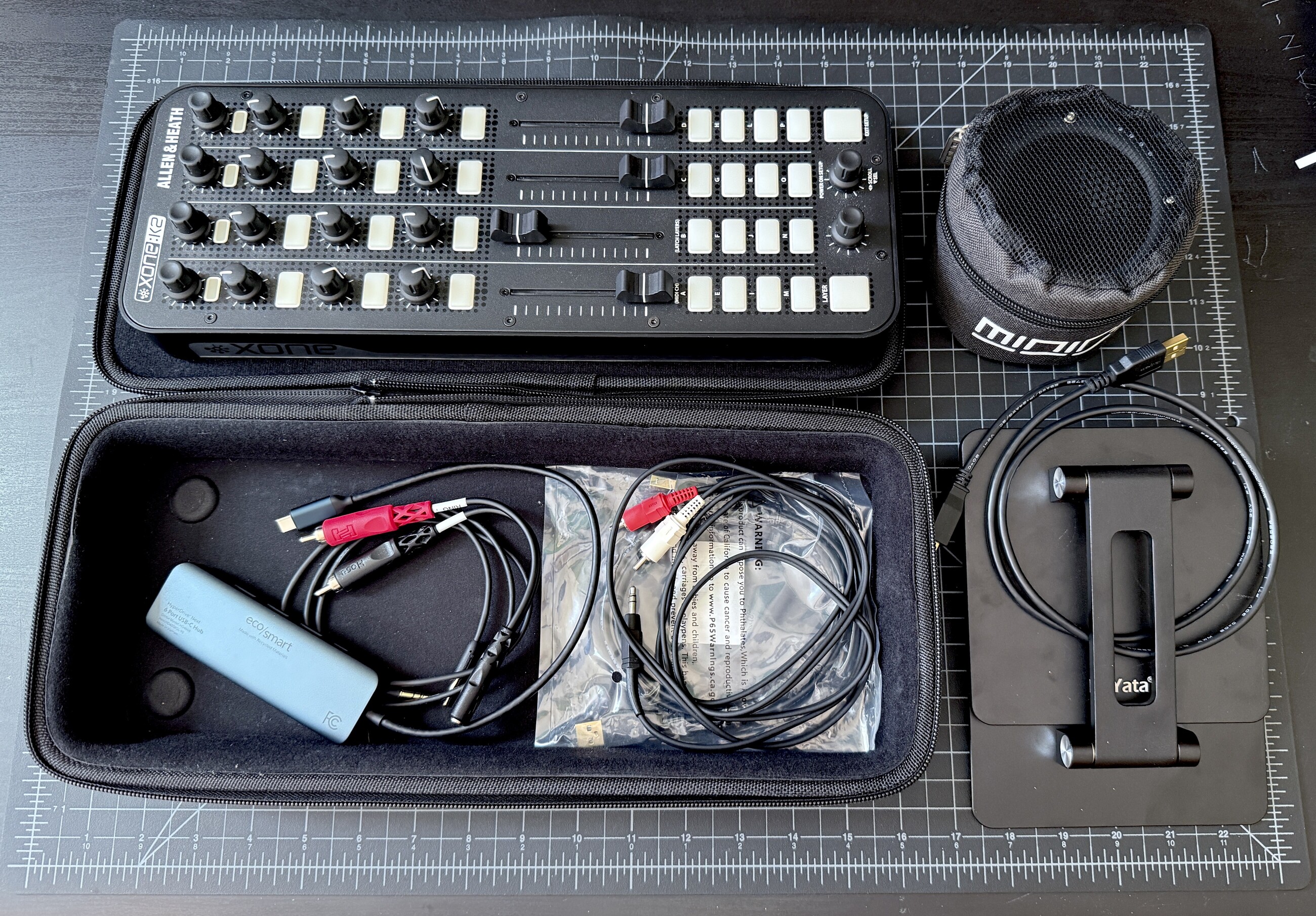 2018 iPad Pro, Xone K2, usb-C hub (with power in – I can use a power bank or wall power, but the iPad will run the rig for 45 minutes or so), aluminum iPad stand from eBay. Minirig 4 as needed.