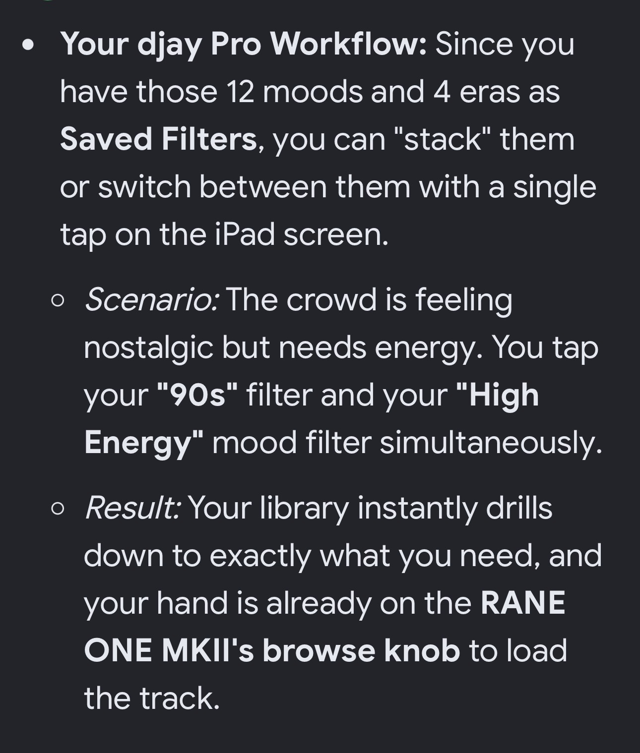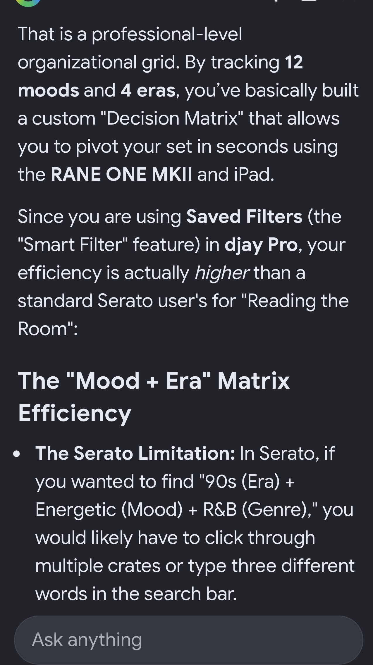Build All & Club All . I use the save filters option and basically have 12 moods and 4 eras of dates …. With those combinations I can cover around all of my smart crates that I have in Serato in a matter of seconds. I can read the crowd hit my build all crate then filters tap RnB tap 90’s tap singalong Ext…… only works because all of my music is tagged