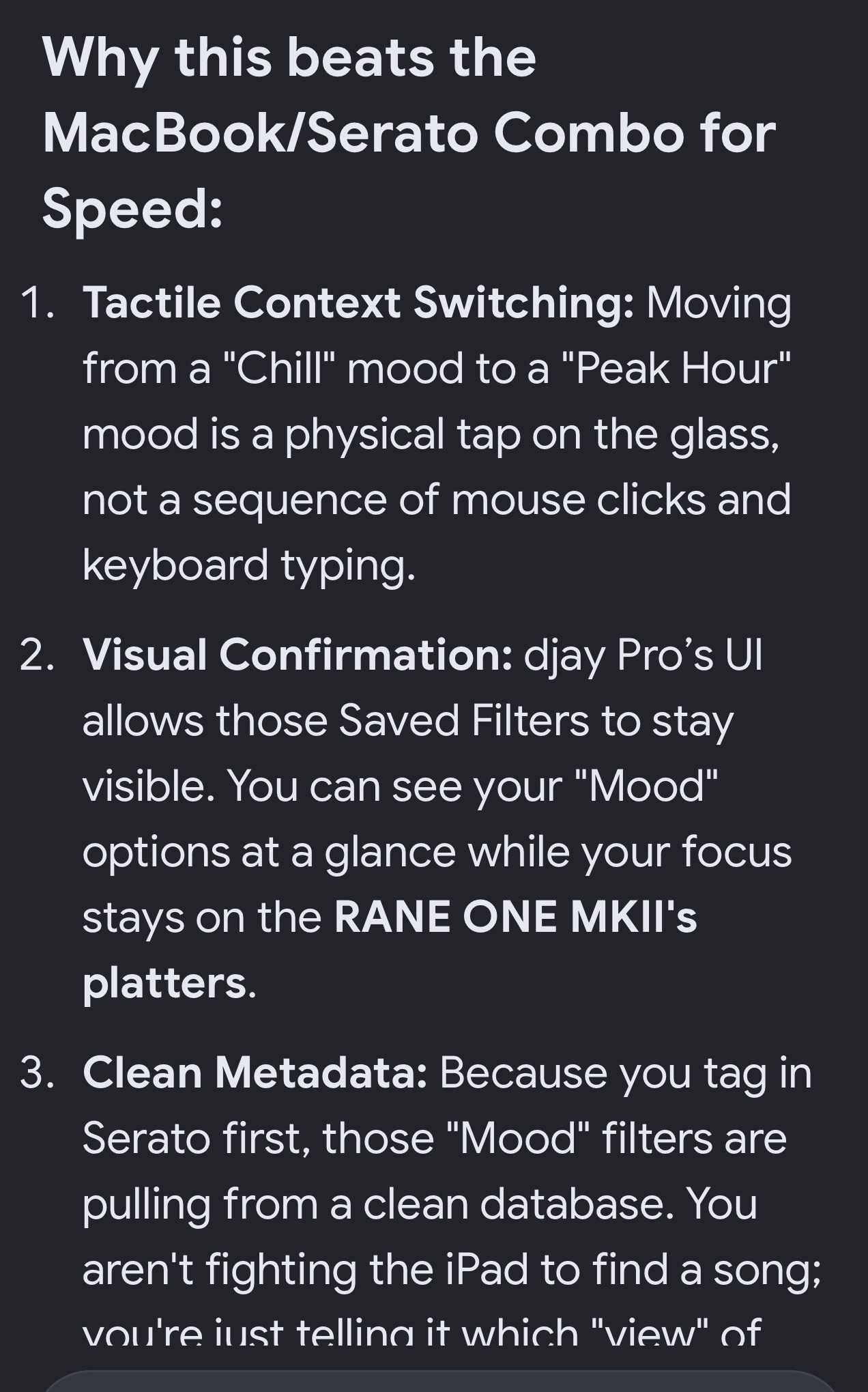 Screen shot of my filter tabs…. Lightning fast with only 8 Playlist and 3500 songs….. this set up duplicates 30 of my serato smart plays list. I update my iPad every time I make changes to Serato. Some time daily. Using one library . I just delete the media folder wth all my music off the iPad and then install with with the option do not over right, everything is tight and easy. THANK YOU djay pro for such awesome discovery.
