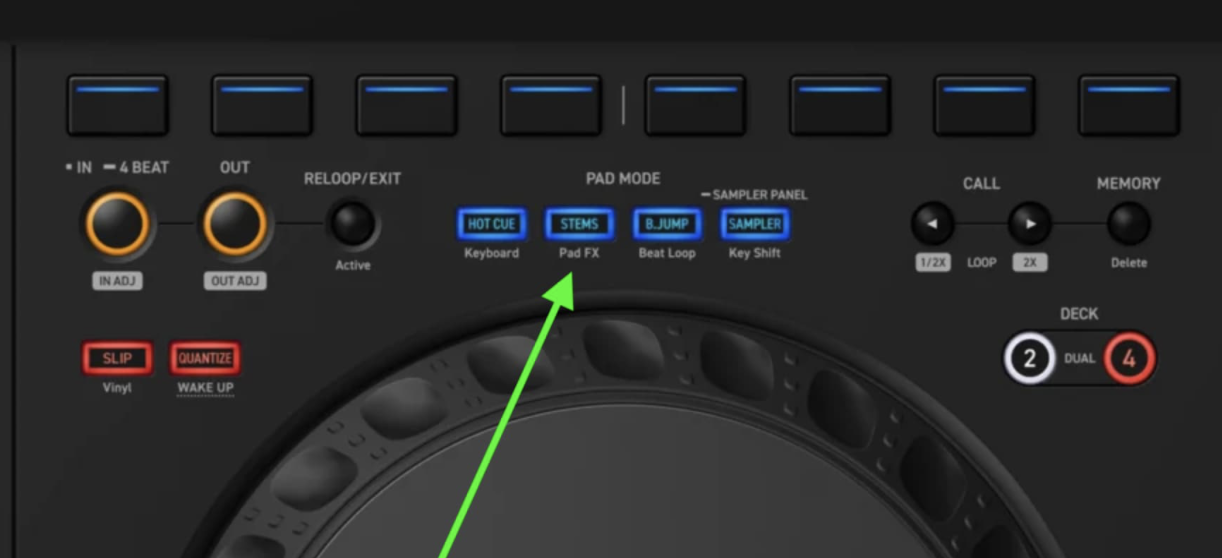To get to Pad FX on my controller I need to press Shift + STEMS button: