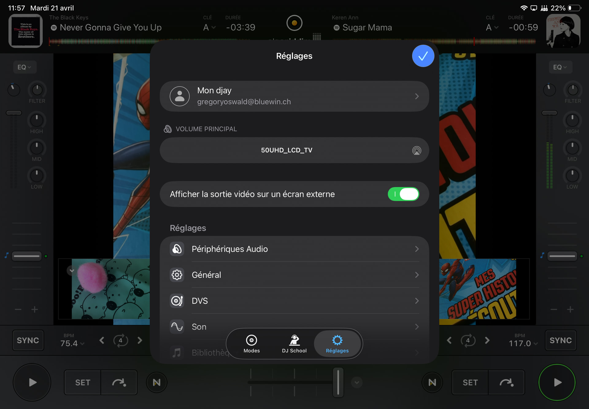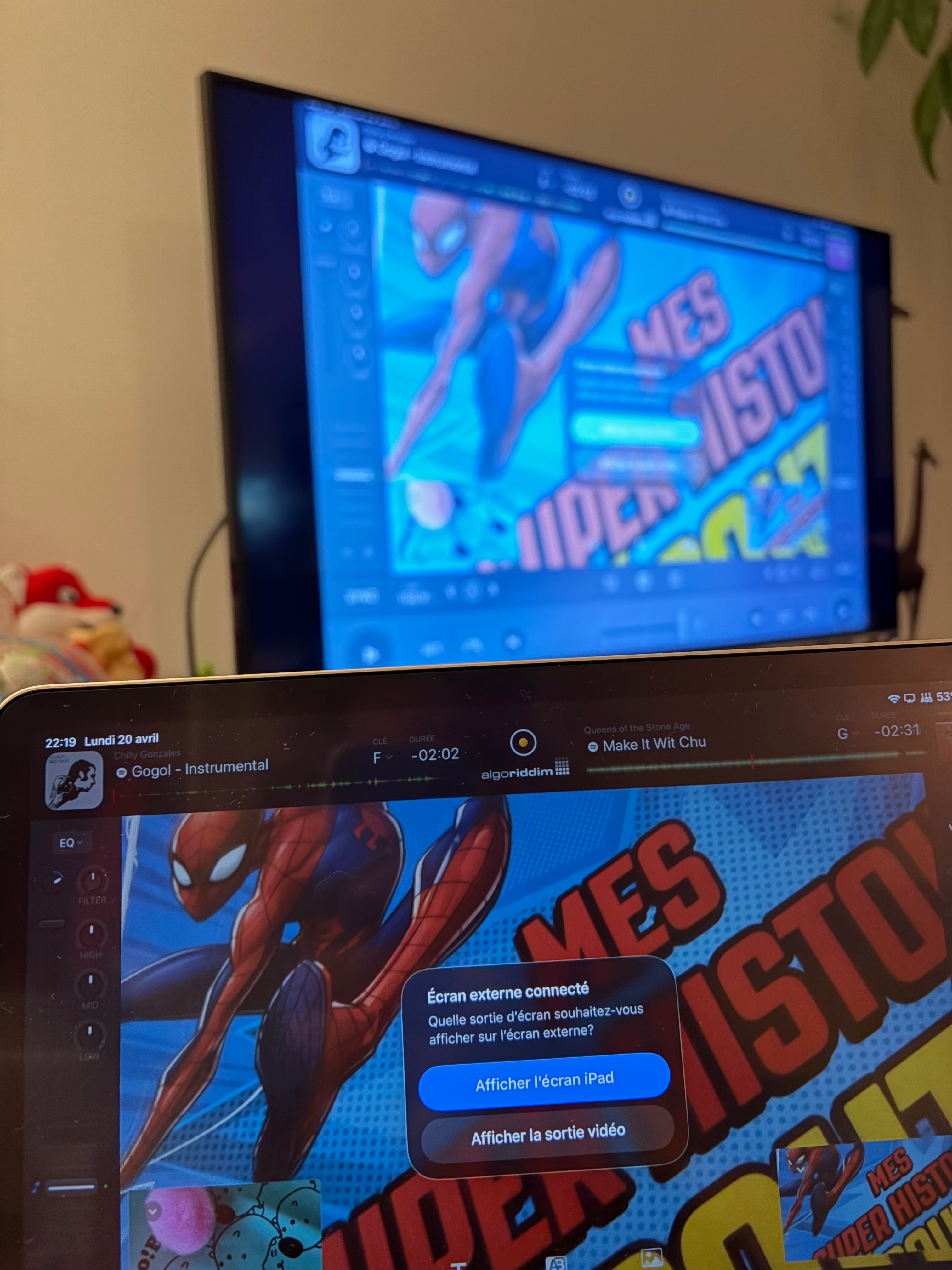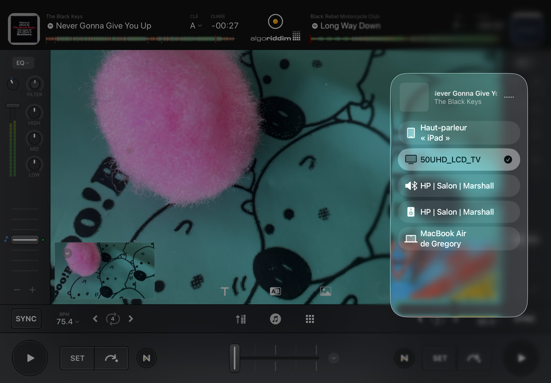 Picture showing (not uploaded as new user can only upload on pic) my iPad’s screen (deck 1 video output + deck 2 video output videos + the main video output, two tracks and two live images loaded) + TV exactly mirroring iPad’s screen in the back of the picture. Connexion between the two devices works.