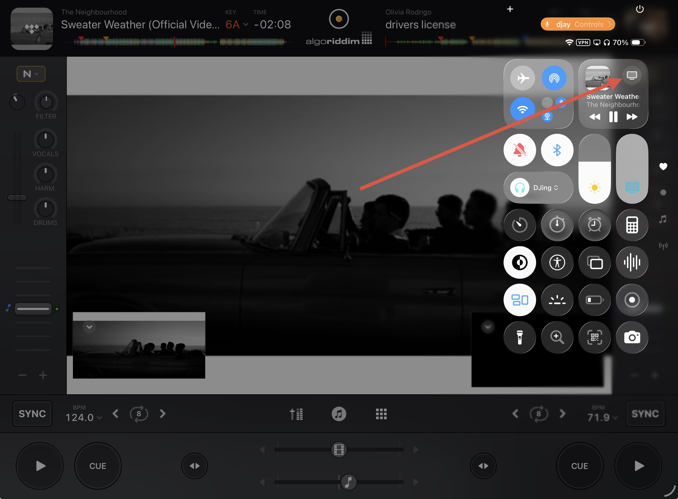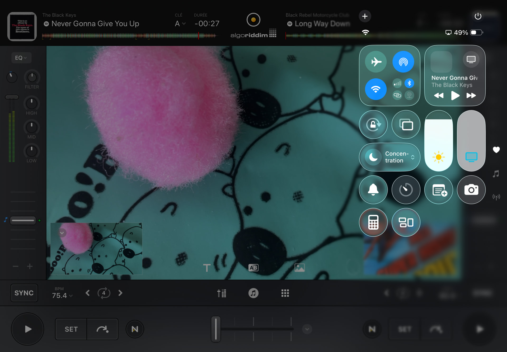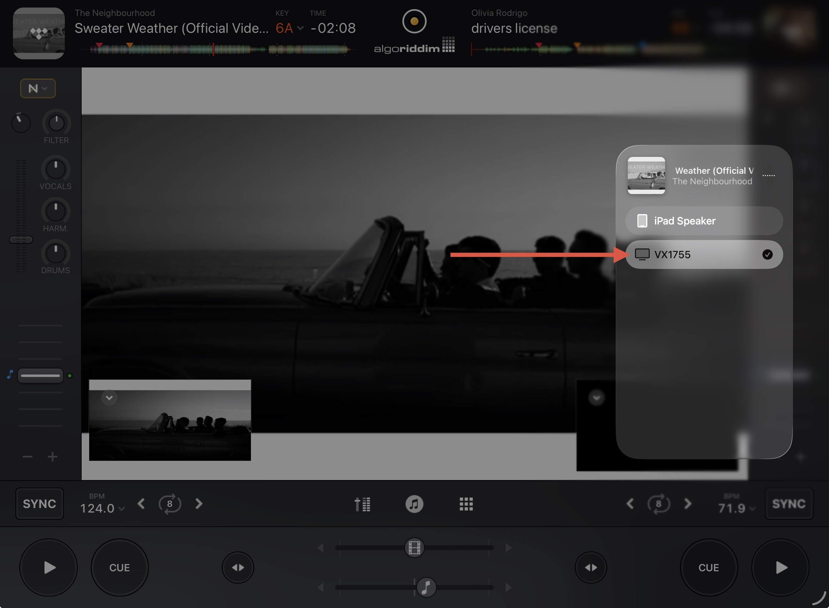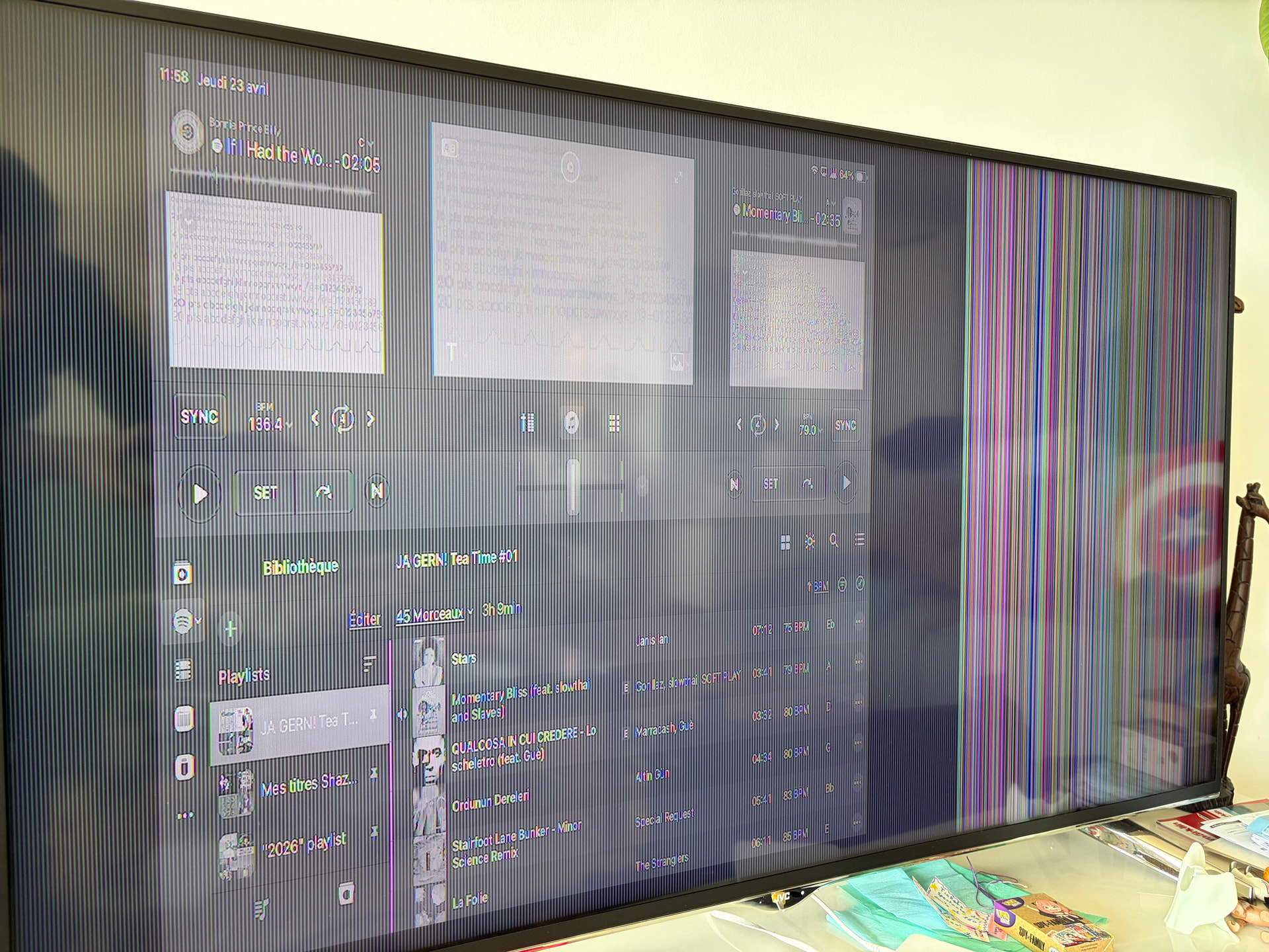 Picture showing (not uploaded as new user can only upload on pic) my iPad’s screen (deck 1 video output + deck 2 video output videos + the main video output, two tracks and two live images loaded) + TV exactly mirroring iPad’s screen in the back of the picture. Connexion between the two devices works.