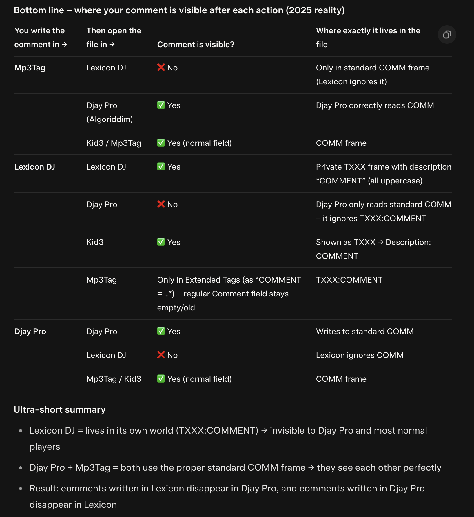 Lexicon DJ = lives in its own world (TXXX:COMMENT) → invisible to Djay Pro and most normal players