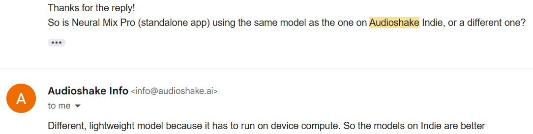 I asked Audioshake if the model in Neural Mix Pro is the same as the one on Audioshake Indie.